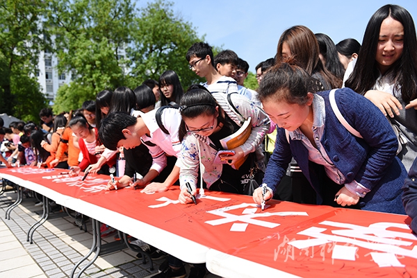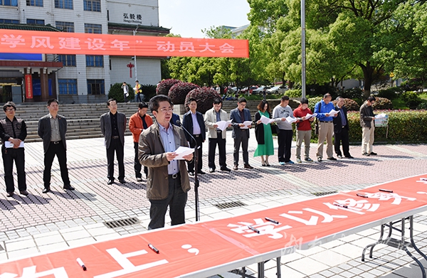 本网讯(记者 代天 摄影 何帅文)4月18日下午,学校“学风建设年”动员大会在文化广场举行。校领导、教师代表及学生代表近700名师生共同在横幅上签字,学校“学风建设年”活动正式启动。