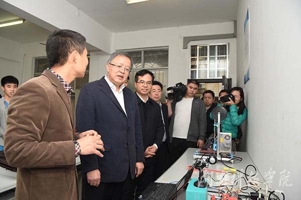 本网讯(记者 张云芳 摄影 何帅文)4月7日下午,省政协副主席欧阳斌、省政协文史学习委员会主任张智军等一行在永州市政协主席唐定、市政府副市长刘尤碧等领导的陪同下莅临我校,考察了电子与信息工程学院创新创业中心、外国语学院菁菁书院、美术与艺术设计学院大学生创新训练中心、图书馆、音乐楼、体育馆。校领导陈弘、曾宝成、宋宏福、郑山明、李常健、程智开陪同调研。