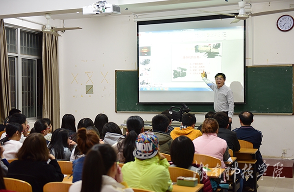 管顺生结合案例视频用图文并茂的方式向师生详细介绍了摄像机的主要构成、图像处理以及类别等知识,讲解了电视摄像的景别、构图等理论,分析了电视摄像的黄金分割法、三等份分割法等技巧,围绕对电视新闻采写与摄制技巧的专业技能要求对电视摄像进行了生动的讲课。