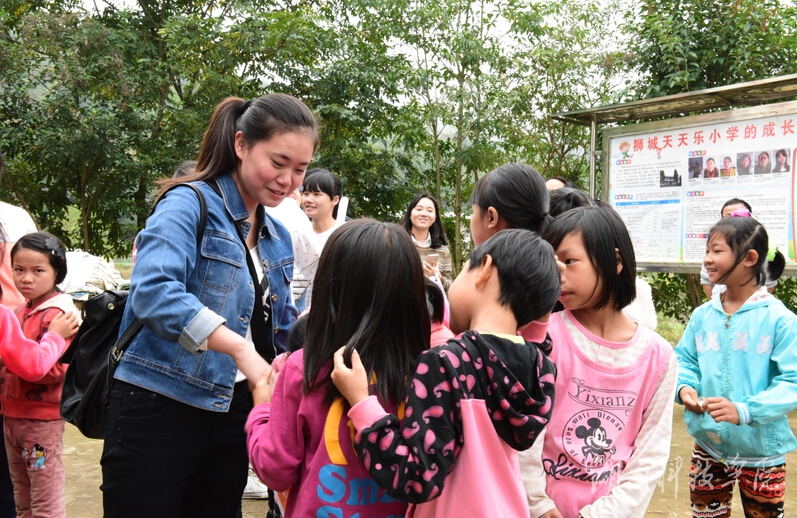 操场上,孩子们列队整齐,眼神中充满了期盼。志愿者们纷纷上前,带领孩子们做游戏,开展体验活动。孩子们被分成八个小组,由志愿者们带队欢快地围绕在他们的身边,唱啊跳啊,高兴极了。他们时而围成一圈,时而跳起“踢踏舞”,时而猜起了谜语……,尽管秋雨阴冷,但近两个小时的活动很快就结束了。活动结束时,孩子们还高兴地领到了发给他们的“最佳团队奖”、“最具创意奖”、“最具活力奖”等奖状和学习用品、书本等奖品。