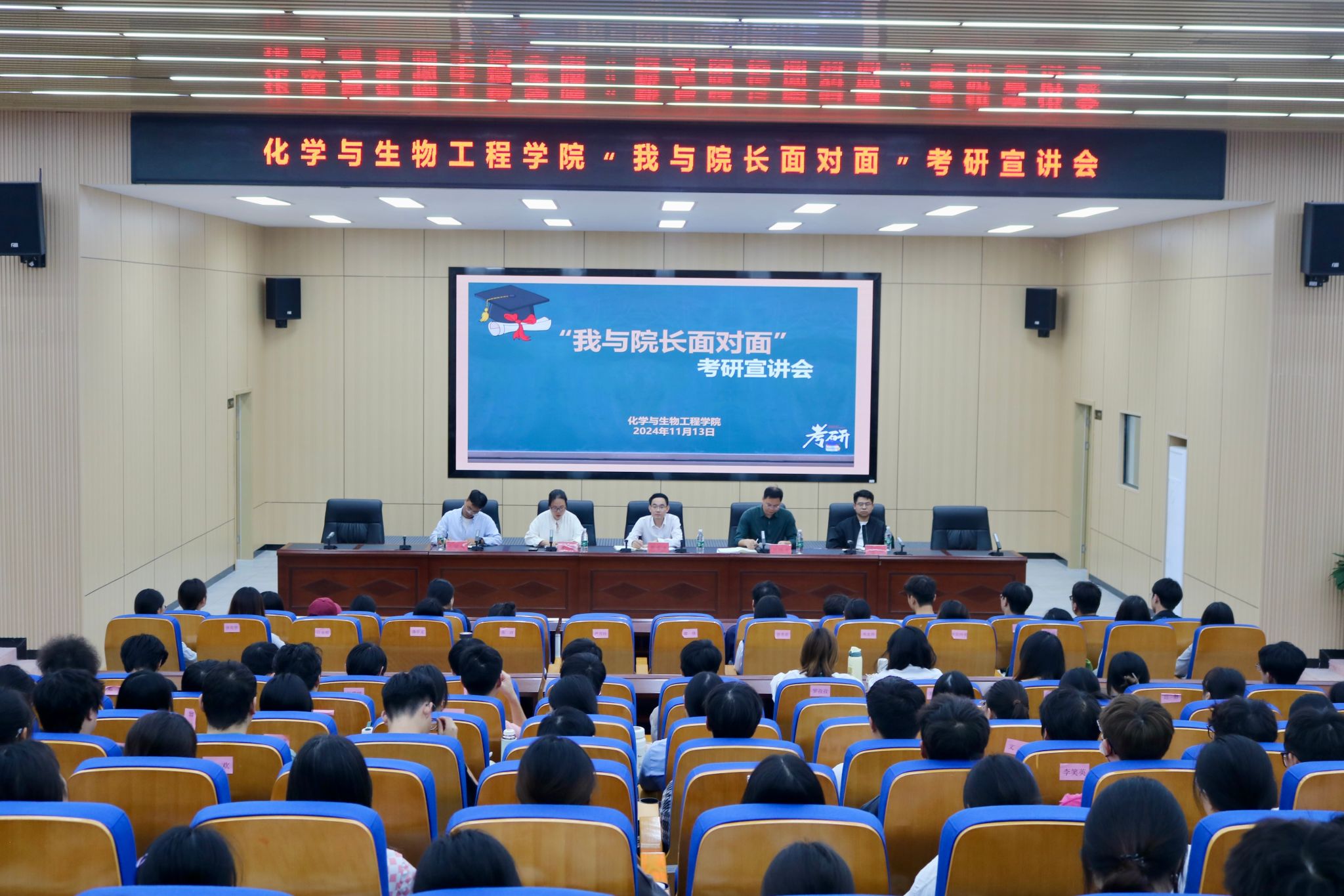 (本网讯 王婧)以梦为马,不负韶华。为了营造勤学善思的良好学风,助力考研服务指导。11月13日,化学与生物工程学院于明德楼100会议厅成功举办了2024年“我与院长面对面”考研宣讲活动。化学与生物工程学院院长覃佐东、党总支副书记基艳、廖旭博士和王斌斌博士出席会议,会议由党总支书记刘国华主持,2022级学生参加会议。