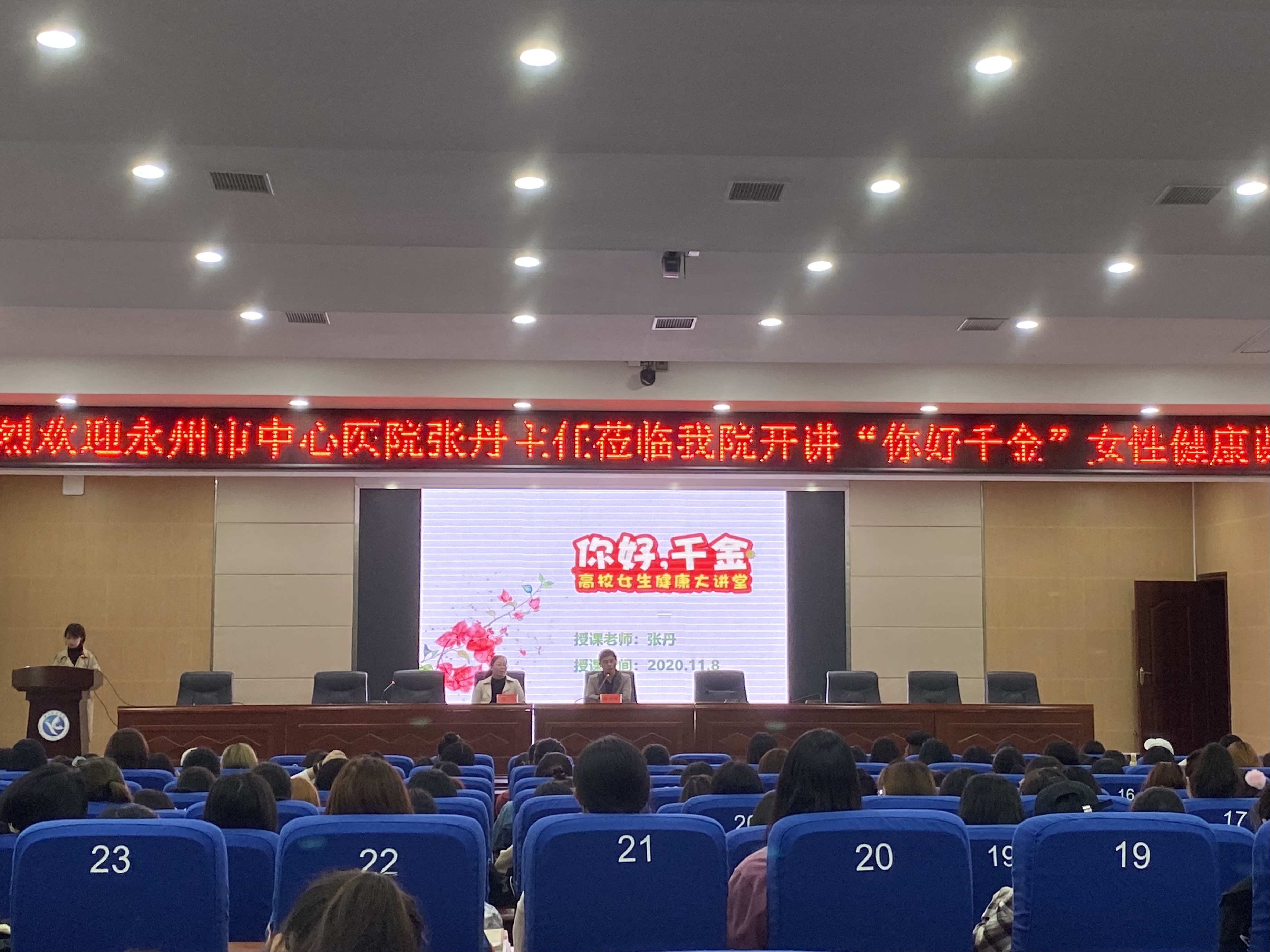 本网讯 11月8日晚,由化生学院、传媒学院主办,永州市中心医院与千金药业集团承办的“你好,千金”主题女性健康讲座在潇湘大讲堂举行,讲座由永州市中心医院妇产科张丹副主任主讲。化学与生物工程学院、传媒学院2019级和2020级全体女生聆听了讲座。
