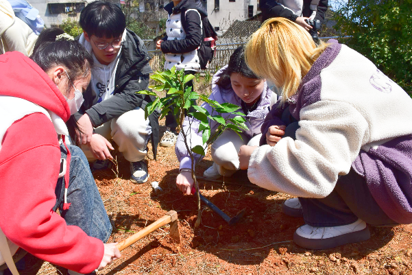 活动现场同学们热情高涨,王宗成老师结合生物学科专业知识向同学们讲授绿植栽培、养护和培育的相关经验和方法,让同学们结合协会日常外出采药的实践经验尝试种植树苗。同学们分工明确,铲土造坑、培土围堰、提水浇灌、修枝除草,协力为湘科院校园增添了一抹新绿。在同学们的积极合作下,一株株沃柑和大枣树苗在同学们用心耕耘过的土地上昂首屹立、随风摇曳。