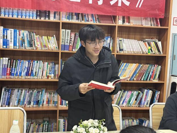 活动伊始,林翰铭就徐光宪的一生事迹进行了导读,为同学们深入了解徐光宪先生的生平与贡献勾勒出清晰的轮廓,激发了大家浓厚的阅读兴趣。随后,集体阅读环节中,现场气氛安静而专注,同学们沉浸在对徐光宪事迹的文字海洋里,促进学生更全面了解其扎根科研一线、突破技术封锁的奋斗历程。在分组讨论环节,同学们围绕“科学家精神的时代价值”、“专业报国的实践路径”等议题展开深度探讨并发表了自己的见解与想法。林翰铭在分享环节中鼓励在场同学以徐光宪为榜样,将他的精神融入到日常的学习与生活中,努力追求卓越,为国家的发展贡献自己的力量。