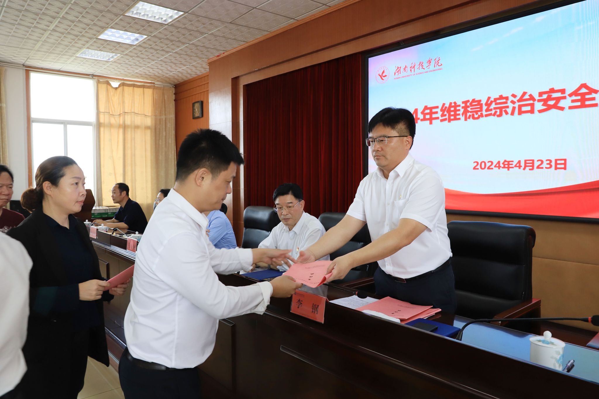 现场,机关单位、教学学院代表向李钢、黄创霞递交了《维稳综治安全工作责任书》。