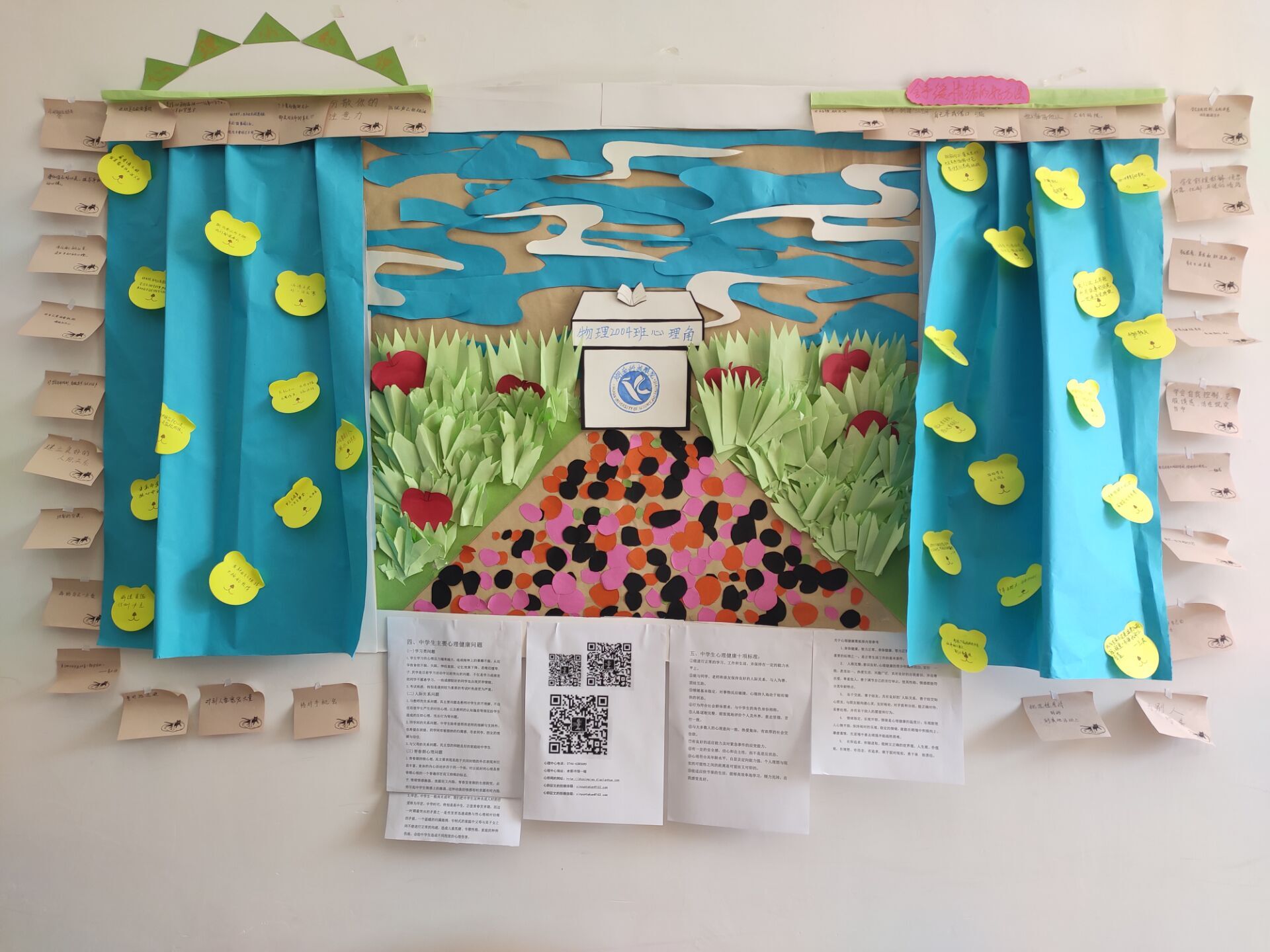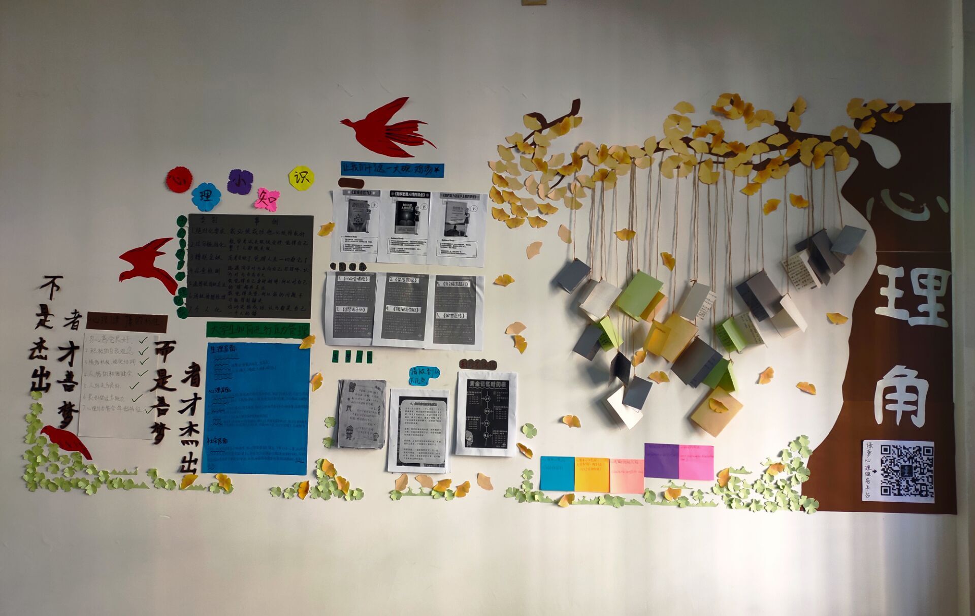 同学们通过各种创意,表达了个人及班级的心理状态及精神风貌,各班心理委员带动班上同学一起,制作了非常美观而又富有趣味的心理角,同学们在制作过程中,收获了团队合作的快乐以及心理健康方面的知识,使制作心理角这个过程变得非常有意义,营造了温馨有爱的班级氛围,同时也让班级原本一片空白的墙壁变得丰富多彩,为班级建设增添了一道美丽的风景线。心理角同时也展示出绿萝心理健康服务平台的二维码、心理中心电话及地址、心桥网网址等便于同学们进行访问,个别班级将绿萝心理健康服务平台的信息与富有设计性的图案相结合,让我们的心理角变得更加的精美,更好地吸引同学们去了解我们的心理健康资讯。