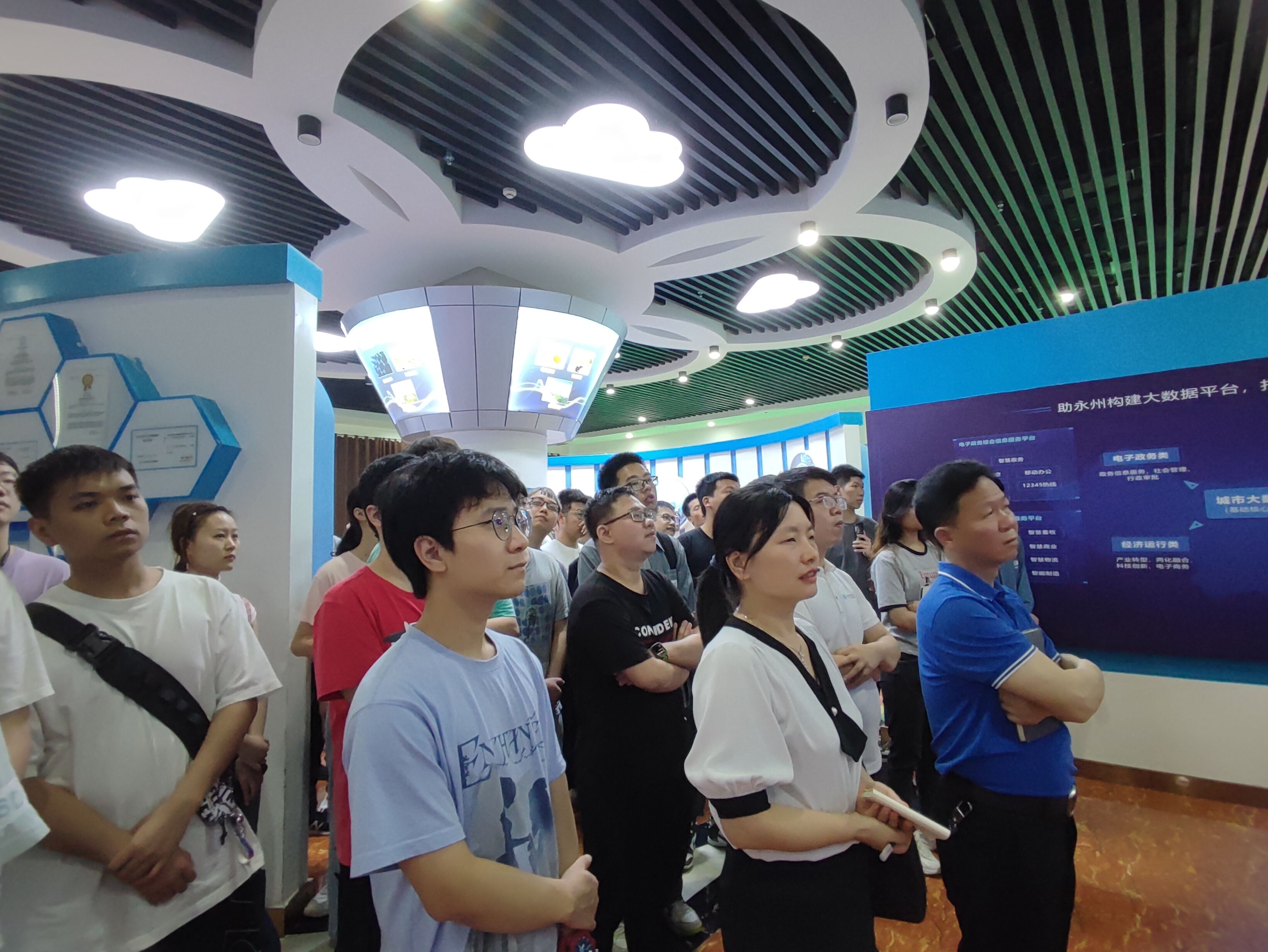 数据中心相关负责人向唐耀平一行详细介绍了公司的基本情况,组织参观了展示区、数据机房、动力区和办公区,并讲解了大数据和可视化系统对智慧医疗、智慧旅游、人脸识别等方面的运用。据悉,永州华为云计算数据中心一期工程规划占地 28.39 亩,总建筑面积 13924.92 ㎡,共设 8 个 IT 机房,具备 1000 个标准服务器机柜的服务能力,具备 48 万核云计算、45P 云存、储和 53000 云桌面的服务能力。数据中心采用国际领先的水冷系统,PUE1.5 以下,是华中、华南金融外最高标准之一,各项性能均优于国内最高标准的 A级机房。