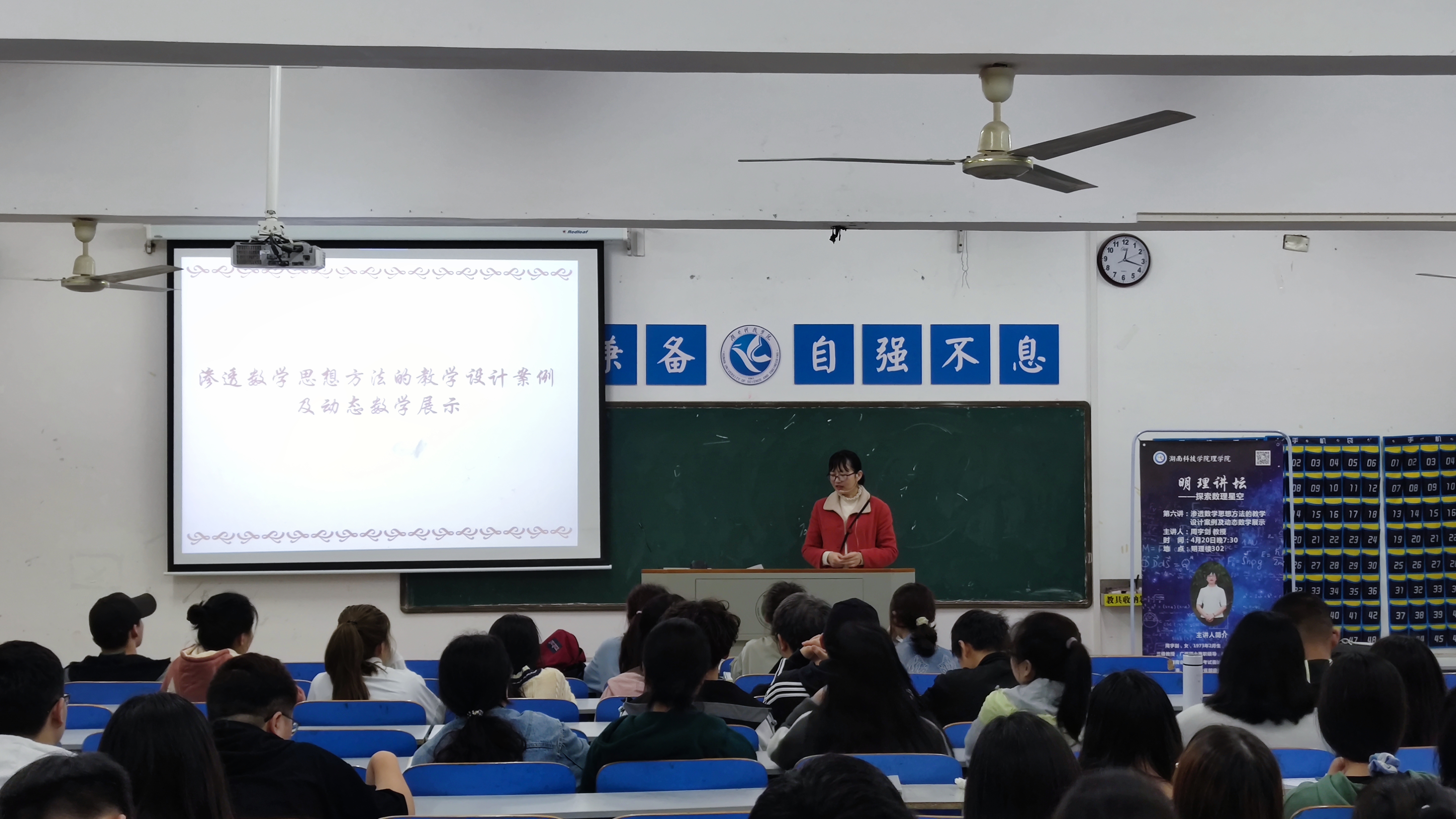 本网讯(通讯员 阳铁雨)4月20日晚,首届数学文化节之明理讲坛第六讲在明理楼202开讲。为了让同学们了解渗透到生活中的数学思想并重视数学思维的重要性,周宇剑教授以实际生活中的事情为例,作了题为“渗透数学思想方法的教学设计案例及动态数学展示”的讲座。