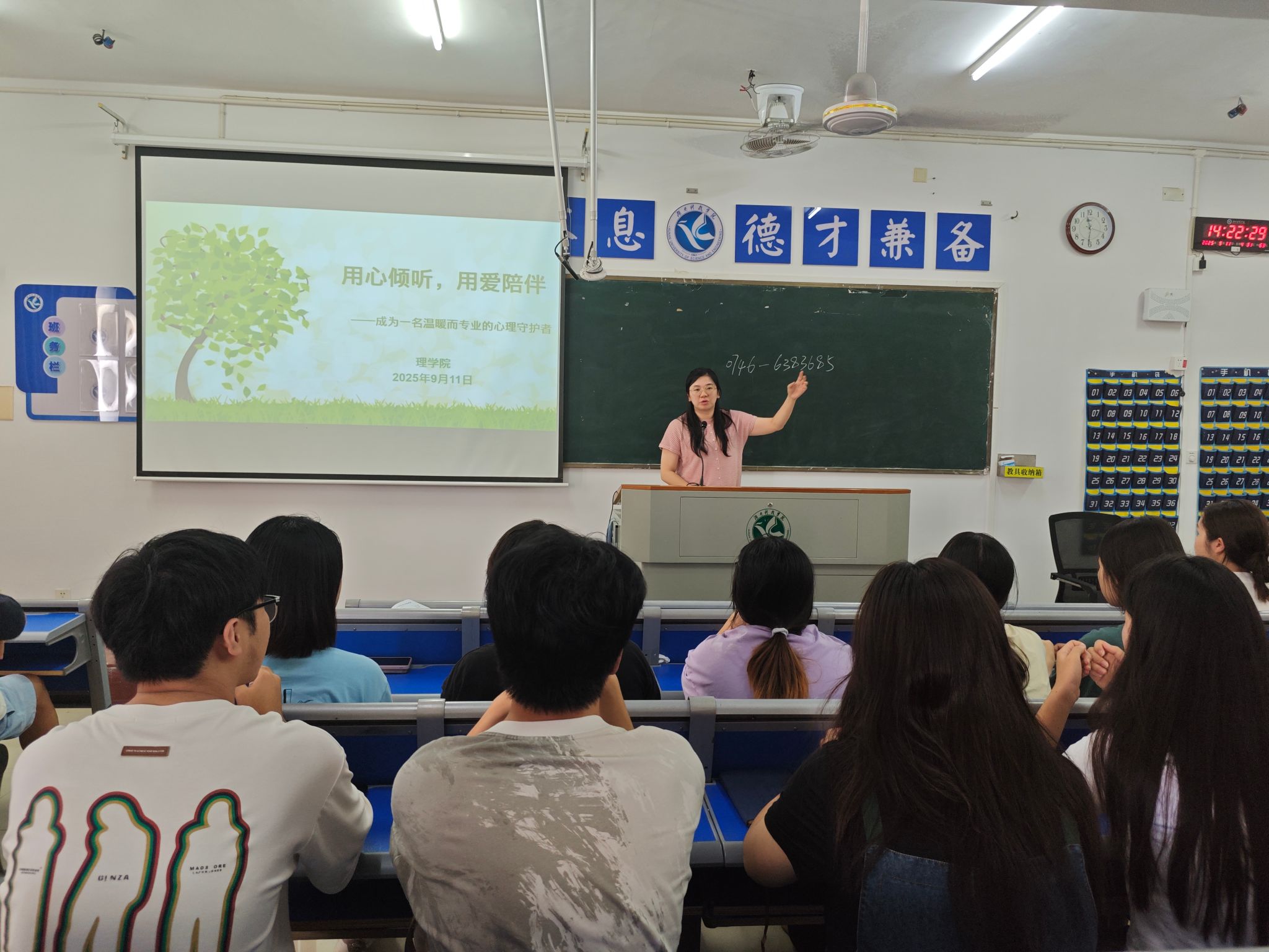 本网讯(通讯员 黄欣欣)为提升心理健康服务专业性,筑牢学院心理健康教育防线。9月11日下午,理学院在明理楼302开展开学季心理信息员培训会,会议有党总支副书记欧阳素勤出席,23、24级全体班干部、心理信息员和学生党员参加,心理专干刘静主持。