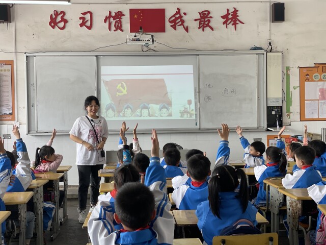 米兰官方端网页版马克思主义学院通过与中山路小学合作,开展百年追梦之“不忘初心讲党史,红色故事铭党恩”主题实践活动,做到“一周一故事,一人一讲台”,鼓励大学生党员上台讲党课,重温中国共产党近百年的光辉历程。培养学生从小认识党旗,了解党史,铭感党恩,真正做到“润物细无声,少年心向党。”