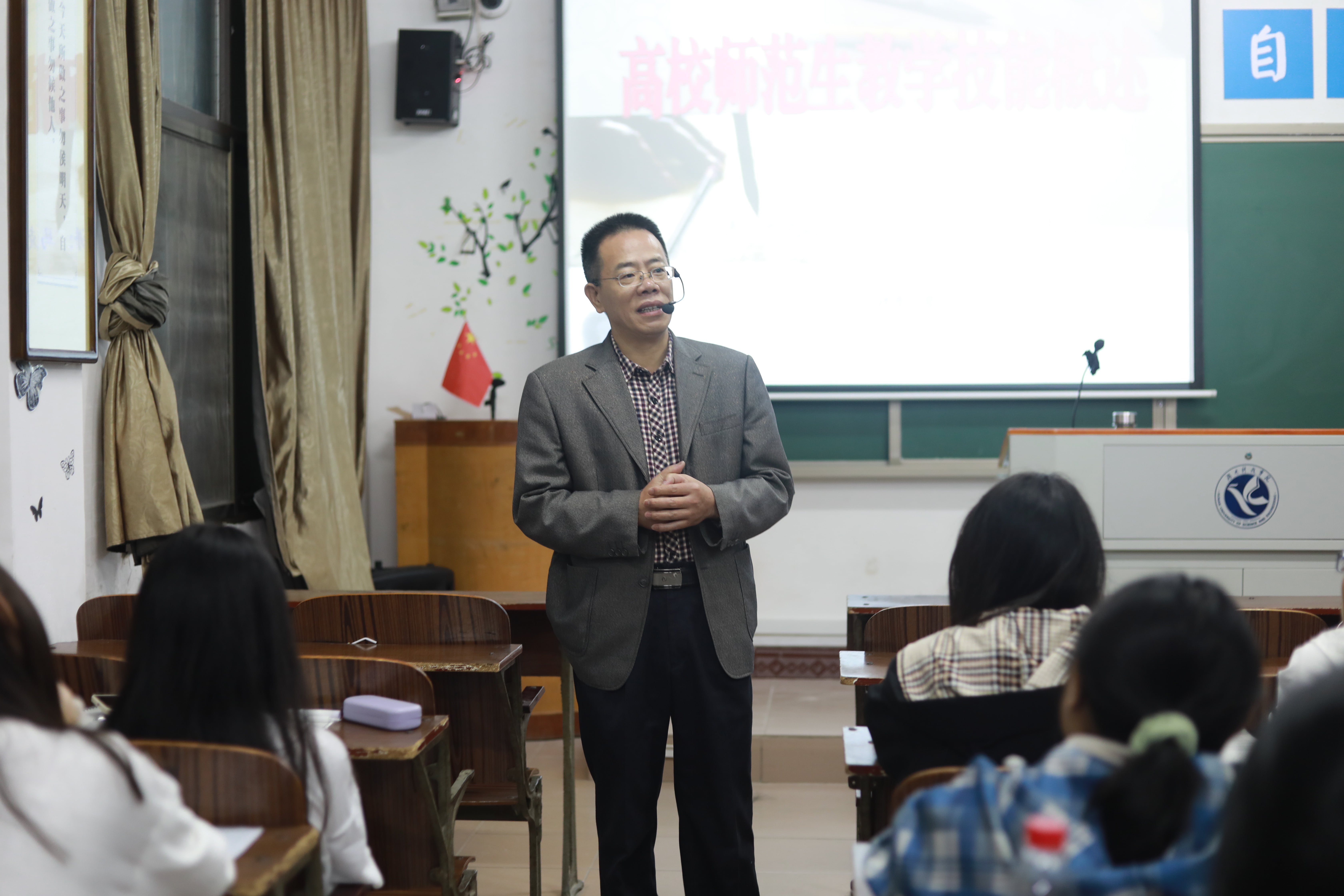杨军以“高校师范生教学技能概述”为题,就硬件技能、隐性的软件技能、教师的基本素养三个方面展开论述,分析当代大学生就业形势及该如何从事教育行业,成为一名优秀的老师。他特别指出,教师需要具备道德素养、知识素养、能力素养。道德素养摆在第一,以德为先,以身作则,才是一个优秀教师的标准。在讲述道德的重要性时,他引用习近平总书记的话——“三观,是人生的总开关。”希望同学们在大学树立远大目标,端正学习态度,不负美好时光。