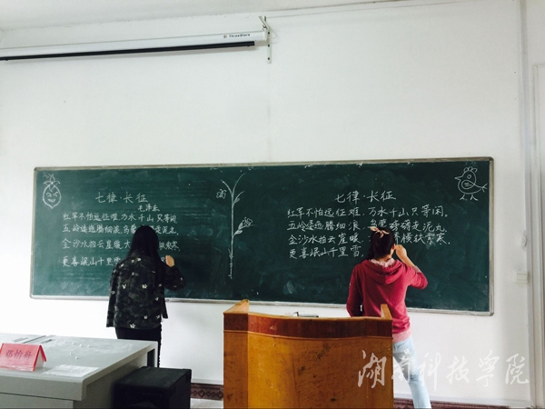 比赛分钢笔字、毛笔字和粉笔字三个小组。钢笔字比赛是以《沁园春·长沙》为书写内容,选手们胸有成竹、屏息凝神、行笔流畅,书写或清秀隽永,或刚劲有力,风格迥异,各具神韵。粉笔字比赛要求两人一组同时书写,在黑板上可自行排版,五分钟内写下指定稿的内容,选手们书写规范、整洁,整体版面设计美观,实用性与艺术性得到了很好的结合。在毛笔字比赛中,选手们挥毫泼墨,起笔、行笔、收笔恰到好处,赢得了评委与观众的啧啧称赞。裴滢、张业文、李丽梅三位同学分别获得粉笔字、钢笔字、毛笔字第一名。