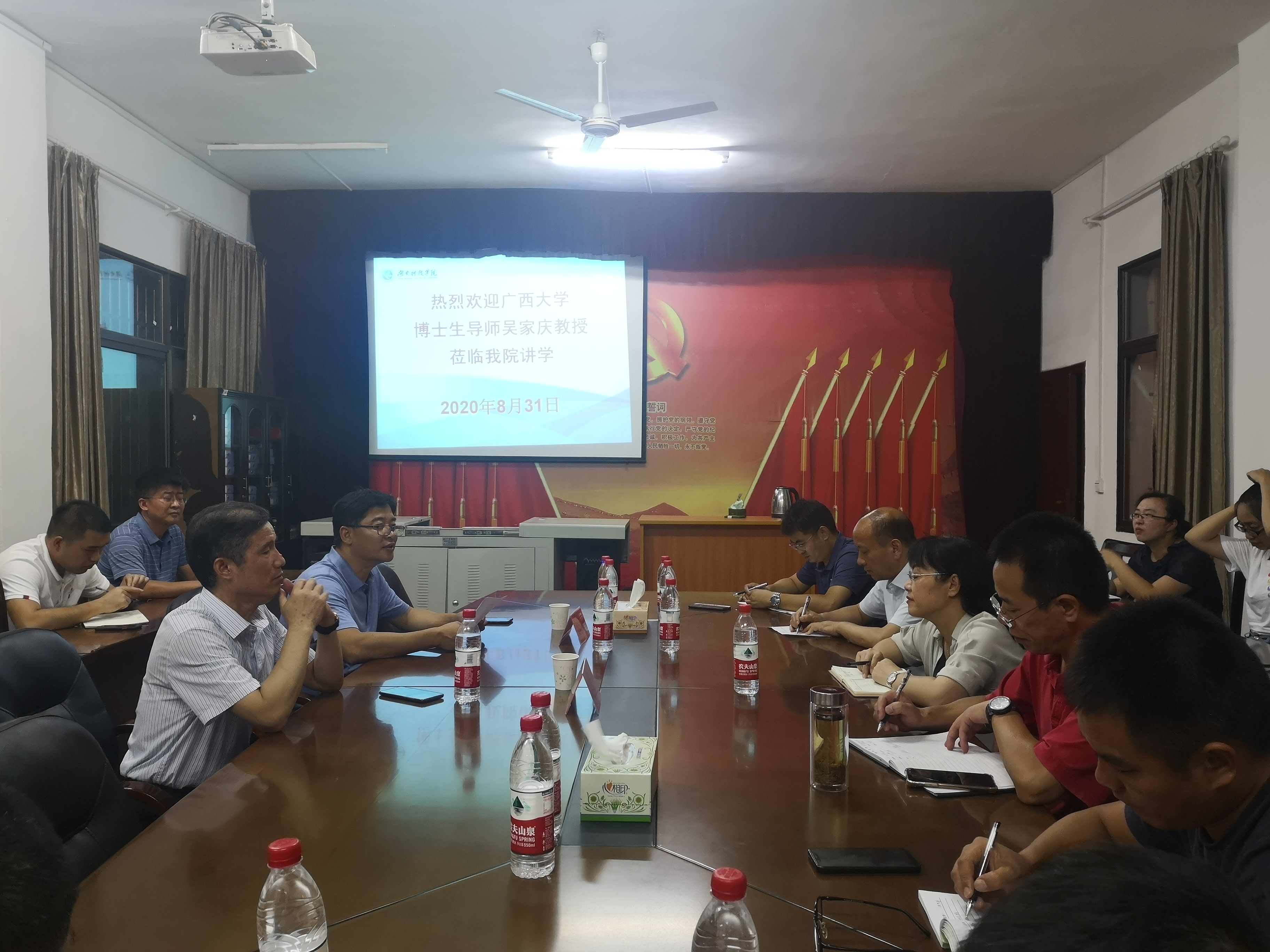 本网讯(通讯员陈猛)8月31日,受马克思主义理论省级应用特色学科邀请,广西大学君武学者特聘教授、博士生导师、国家“万人计划”哲学社会科学领军人才、中央“马克思主义理论研究和建设工程”首席专家吴家庆教授莅临我院,与我院全体教师和部分学科成员分享了马克思主义学院建设与马克思主义学科建设的经验,讲学由校纪委书记彭立威教授主持。
