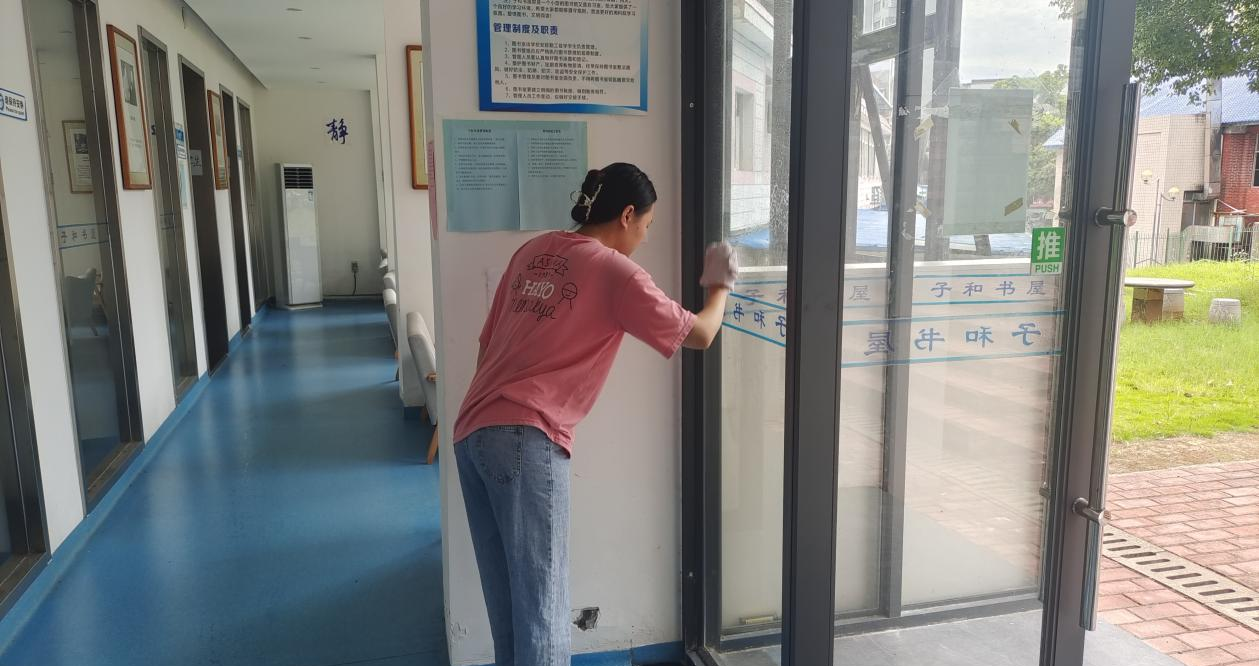 在我院辅导员曹惠如老师的带领下,大家积极配合,分工合作,清扫开展井然有序,认真打扫,走廊和窗户整洁明亮。