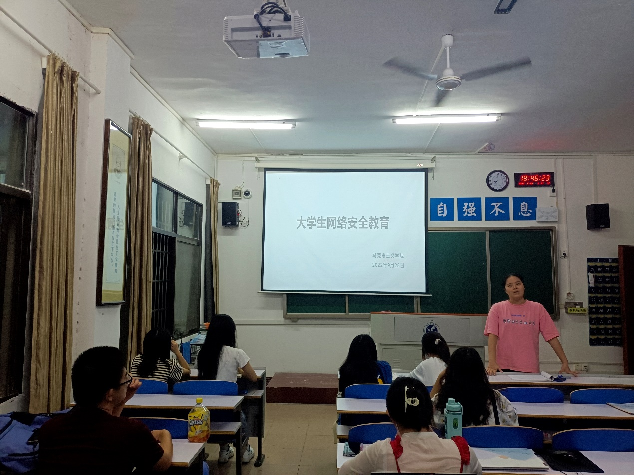 本网讯(记者 张一帆)为切实加强大学生安全教育,9月20日晚,马克思主义学院于鹤鸣楼407教室开展消防安全、网络安全以及反电诈等安全系列教育活动。此次安全系列教育活动由马克思主义学院团总支书记胡非主持,20级学生参加。