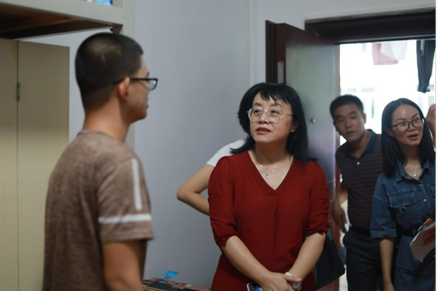 “家是哪里的?”、“生活用品都准备齐全了吗?”、“吃饭、住宿都还习惯吗?”廖雅琴、郑向晖、高丹等来到每间新生寝室与新生亲切交谈,详细了解了新生入学后在住宿、生活方面的情况。在荷园二栋403寝室,来自河北省邯郸的陈晓佳同学在妈妈的陪同下,坐了十几个小时火车才来到学校。廖雅琴院长拉着陈晓佳同学妈妈的手暖心地说:“您一路辛苦了,您放心的把晓佳交给我们,我们这里的每位老师都会像对待自己的孩子一样对待她关心她。”