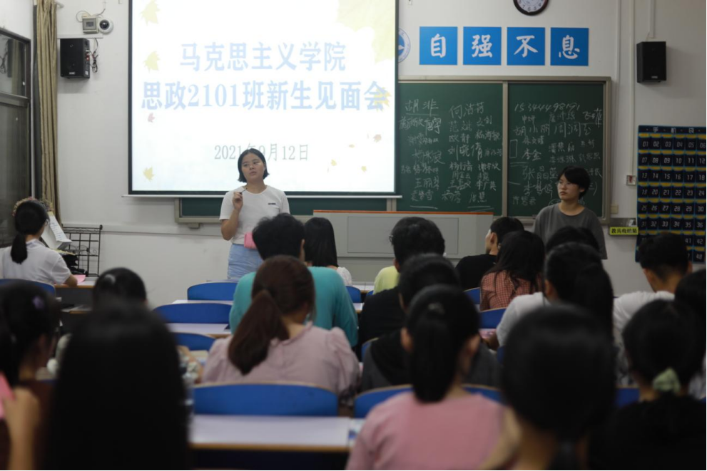 本网讯(记者 吴祖琳)9月12日晚,马克思主义学院思政2101班、2102班分别在鹤鸣楼406、407教室举办新生见面会。2021级辅导员胡非、思政2101班班主任吴霞、思政2102班班主任符小勇及各班学生副班主任邓雨双、黄秋妮出席本次活动,全体21级学生参加。
