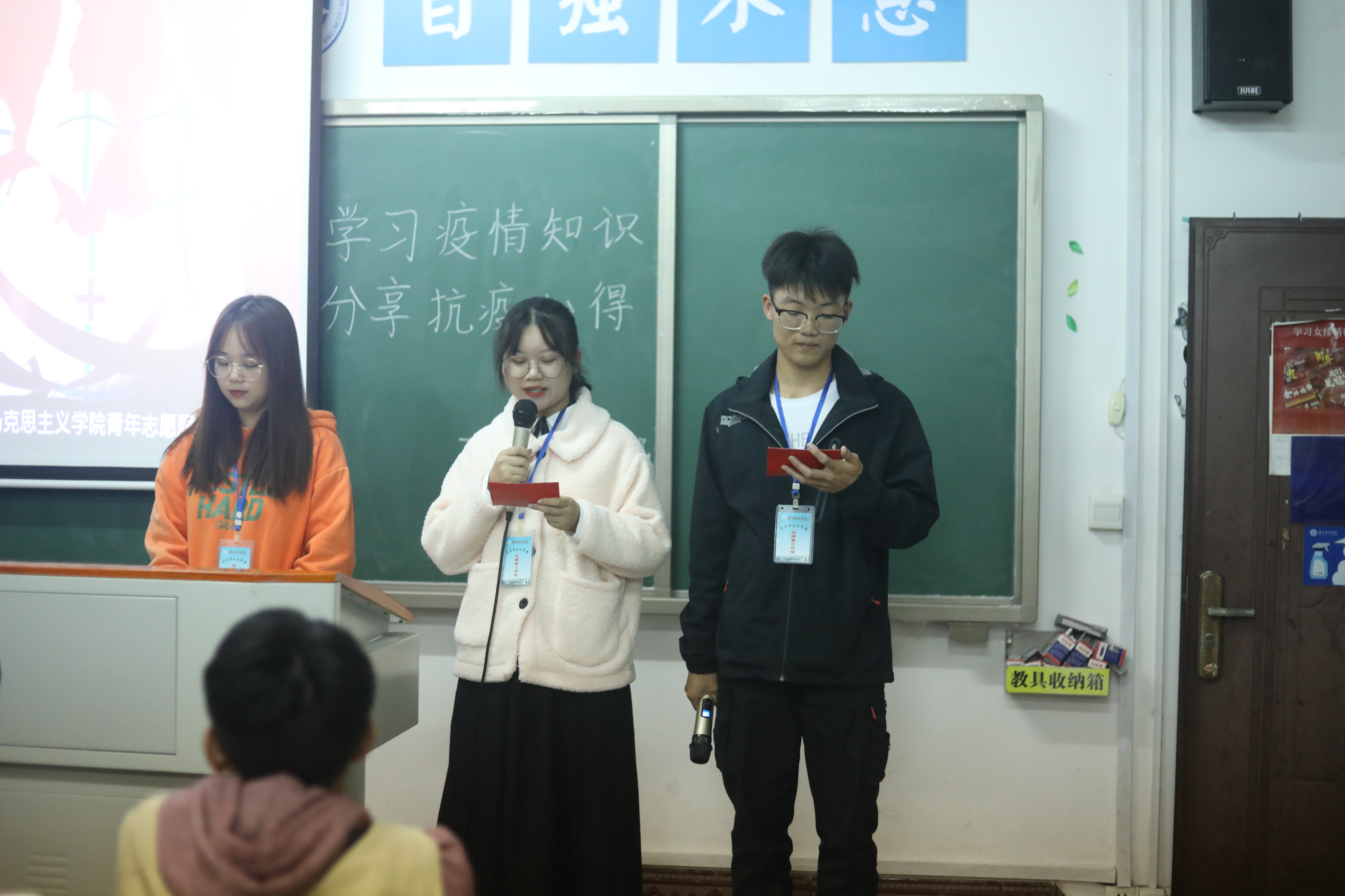 最后,18级与19级学生代表分别向同学们展示了疫情下志愿者服务工作的照片,分享了他们的抗疫小故事,同学们坐在台下认真观看、聆听,并表示要向他们学习。