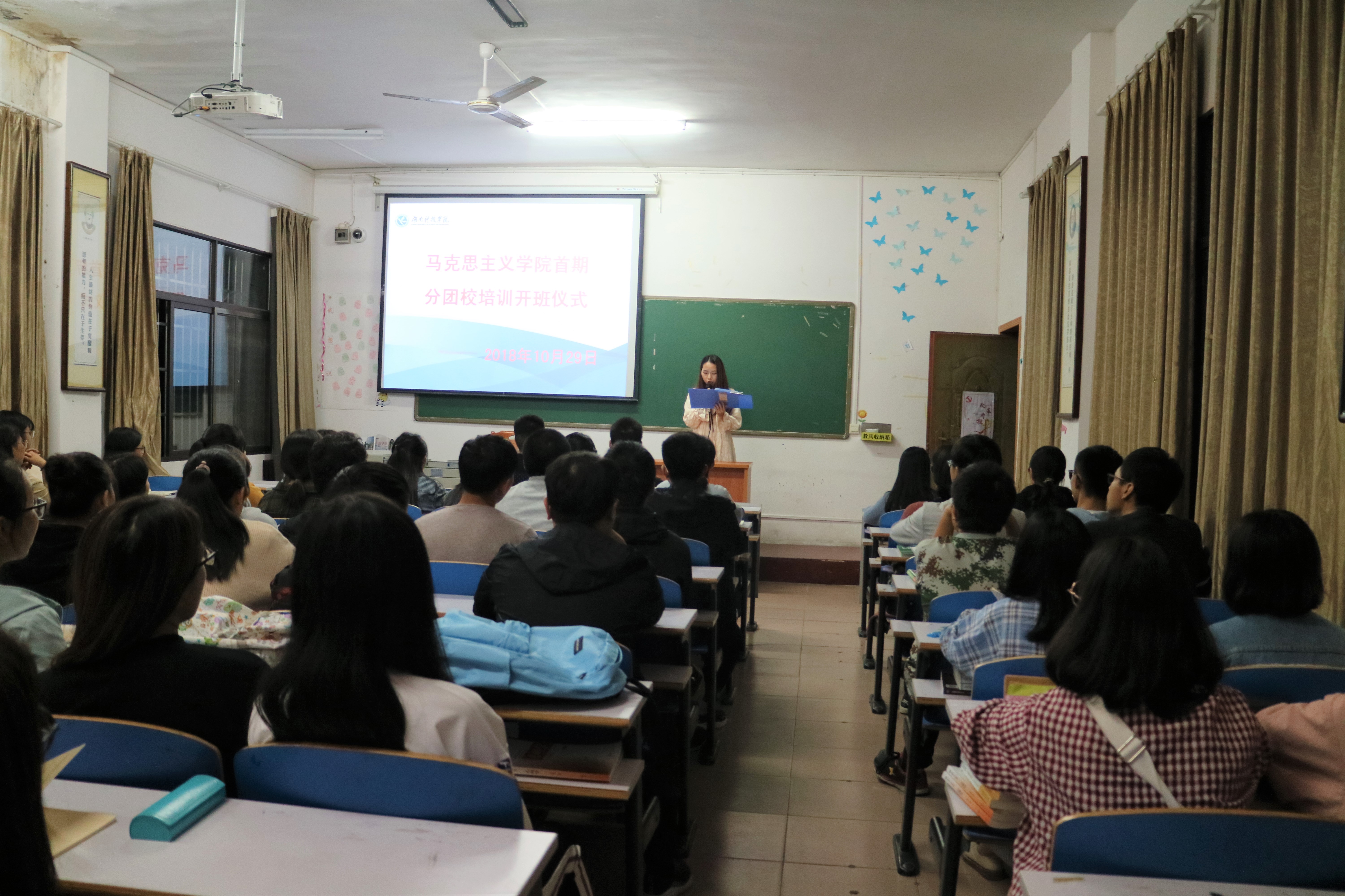 本网讯(通讯员 尹玉婷 黎雪平)马克思主义学院2018年下期分团校培训开班仪式于10月29日晚在鹤鸣楼407教室举行。该院党总支副书记兼副院长高丹老师、分团委书记全伟老师出席仪式,团学联全体干部及17、18级班团干部参与。