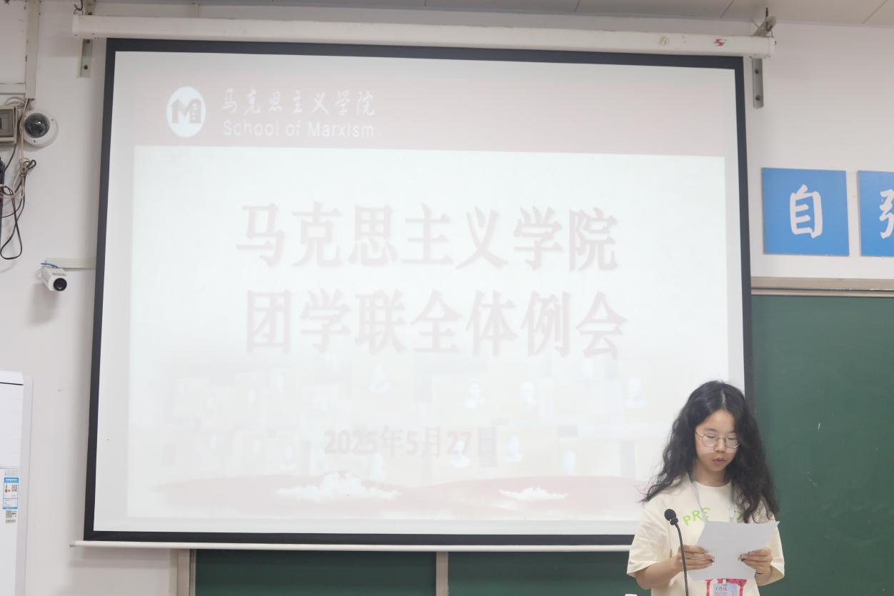 本网讯(记者 李嘉瑶)5月27日,马克思主义学院召开第十一届团学联全体例会,学院党总支副书记高丹、学工办副主任曹惠如、辅导员吴志伟、团学联全体成员参加会议。会议总结了本学期的工作成绩和收获,明确了未来工作方向和重点。