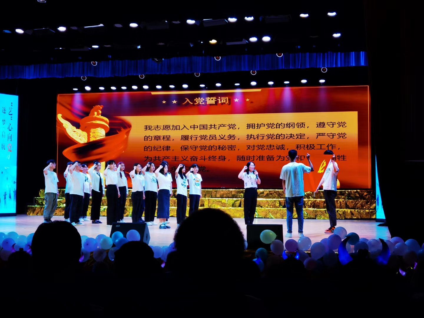 党总支书记刘华带领预备党员们进行了庄重的入党宣誓。现场顿时响起了阵阵激昂的宣誓声,每个同学都用发自内心的声音抒发对党忠诚的决心,面对着党旗,大家接受了一次身心的特殊洗礼,进一步增强了使命感。