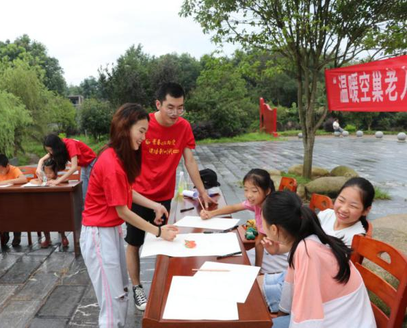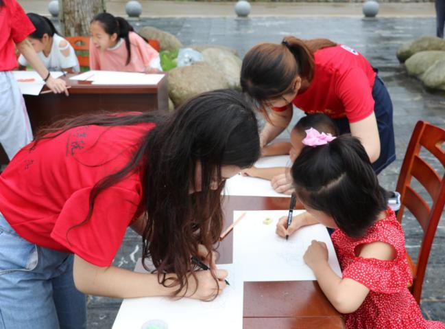 大手握住小手,笔端在纸上游走!美院志愿者弯下腰,低声细语与孩子们交流手把手的方式传递给孩子们大大的能量美院志愿者在孩子们需要关怀时伸出手,给予了留守儿童真挚的关心与爱!