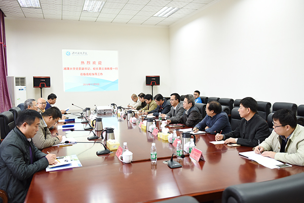本网讯 11月9日下午,湘潭大学校长黄云清一行5人来校调研。校党委书记陈弘,校长曾宝成,副校长宋宏福、郑山明、李常健热情接待,并与黄云清一行进行了交流座谈。