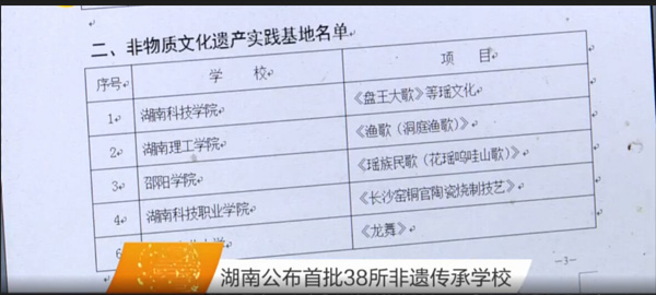 1月13日,湖南卫视新闻联播发布《湖南省公布首批38所非遗传承学校》,介绍我校《盘王大歌》等瑶文化项目。