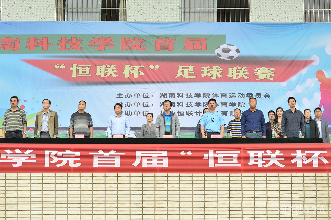 本网讯(记者 孙艳丽 实习记者 刘禹希)11月6日下午,在激昂的进行曲中,我校首届“恒联杯”足球联赛开幕。校党委书记、校足球运动领导小组组长陈弘出席并致辞,副校长、校足球运动领导小组副组长李常健、程智开及长沙恒联计算机有限公司董事长邓自义等领导嘉宾出席,并兴致勃勃地为首场比赛开球。开幕式由程智开主持。