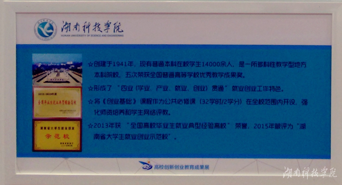 全国总决赛期间,同步举办了高校创新创业成果展(我校是湖南省推荐参加高校创新创业成果展三所高校之一)和“互联网+”产学合作协同育人报告会等活动,国务院副总理刘延东参观了高校创新创业教育成果展、出席了座谈会并发表重要讲话。