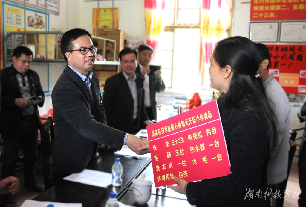 当日上午,校相关部门组织安排车辆装满铁床、电脑、冰柜、电视机、洗衣机、热水器、体育用垫等物品,行驶近两小时来到该校开展爱心捐赠,为大山之中的老师和孩子们送去温暖,解决教学急需用品,帮助坚守在大山深处的我校优秀校友们实现教育微心愿。天天乐小学地理环境偏僻、自然条件恶劣、经济欠发展,唯一通往该地的道路弯曲陡峭,交通、信息落后,而85岁高龄的唐延禄和他的两个孙女,唐千红和唐鲜花却一直坚守于此,并打算在这里教书育人一辈子。我校了解该校的困境和心愿后,号召广大师生汇聚爱心,传递爱和温暖。