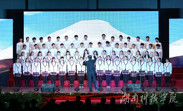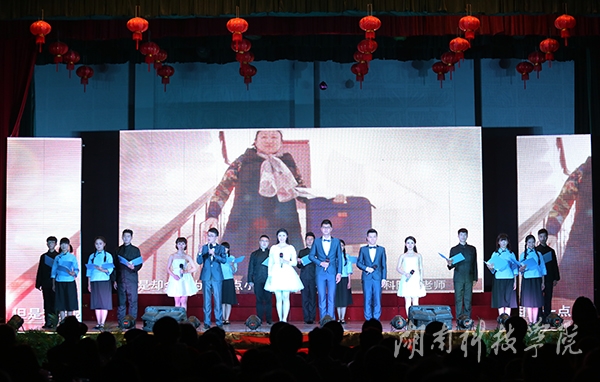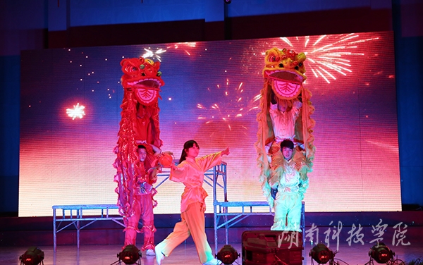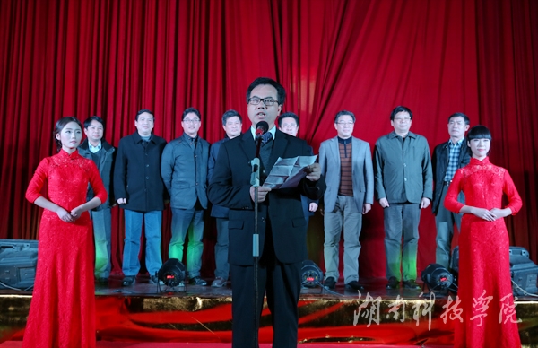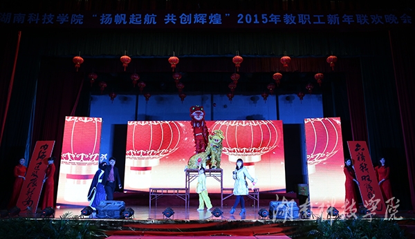 整场晚会的节目安排紧凑活泼、生动有序,教职工们载歌载舞,喜迎新年。晚会以中国的传统习俗舞狮——《新年好》开场,舞狮者的动作变幻灵活,时而腾跃,时而登高,给晚会増添了一丝喜庆和热闹。舞狮期间,我校唐幼铎老师现场挥笔,奉送出一幅豪迈大气、充满美好祝愿的对联:“六精战略强科院,内涵建设展新姿。”紧随其后,我校师生纷纷送上对新年的祝福和对学校发展的美好愿望,其中包括在我校任教的来自印度的Rajesh、Summerl和来自美国的Michael。“群英荟萃在潇湘,潇湘为我展新颜”,一曲《潇湘之歌》道尽科院师生的心声,由李伟老师带领的音乐系合唱团以其恢宏的气势带动了全场的气氛。