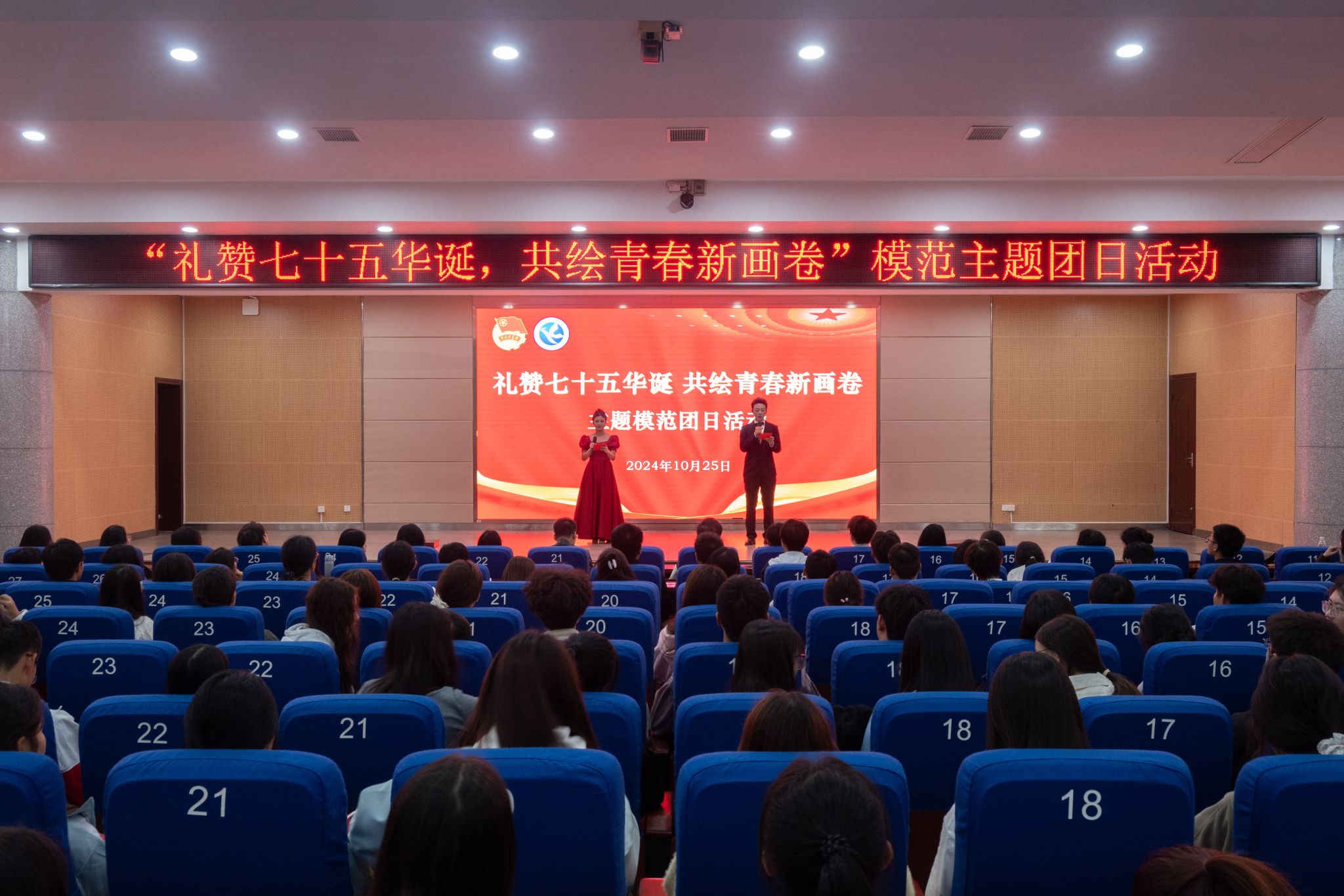 本网讯(通讯员 齐思萱)为热烈庆祝中华人民共和国成立七十五周年,深入学习贯彻习近平新时代中国特色社会主义思想和党的二十届三中全会精神,弘扬爱国主义精神,引导学生坚定理想信念,增强民族自豪感和历史使命感,校团委于10月25日在潇湘大讲堂开展“礼赞七十五华诞,共绘青春新画卷”模范主题团日活动。