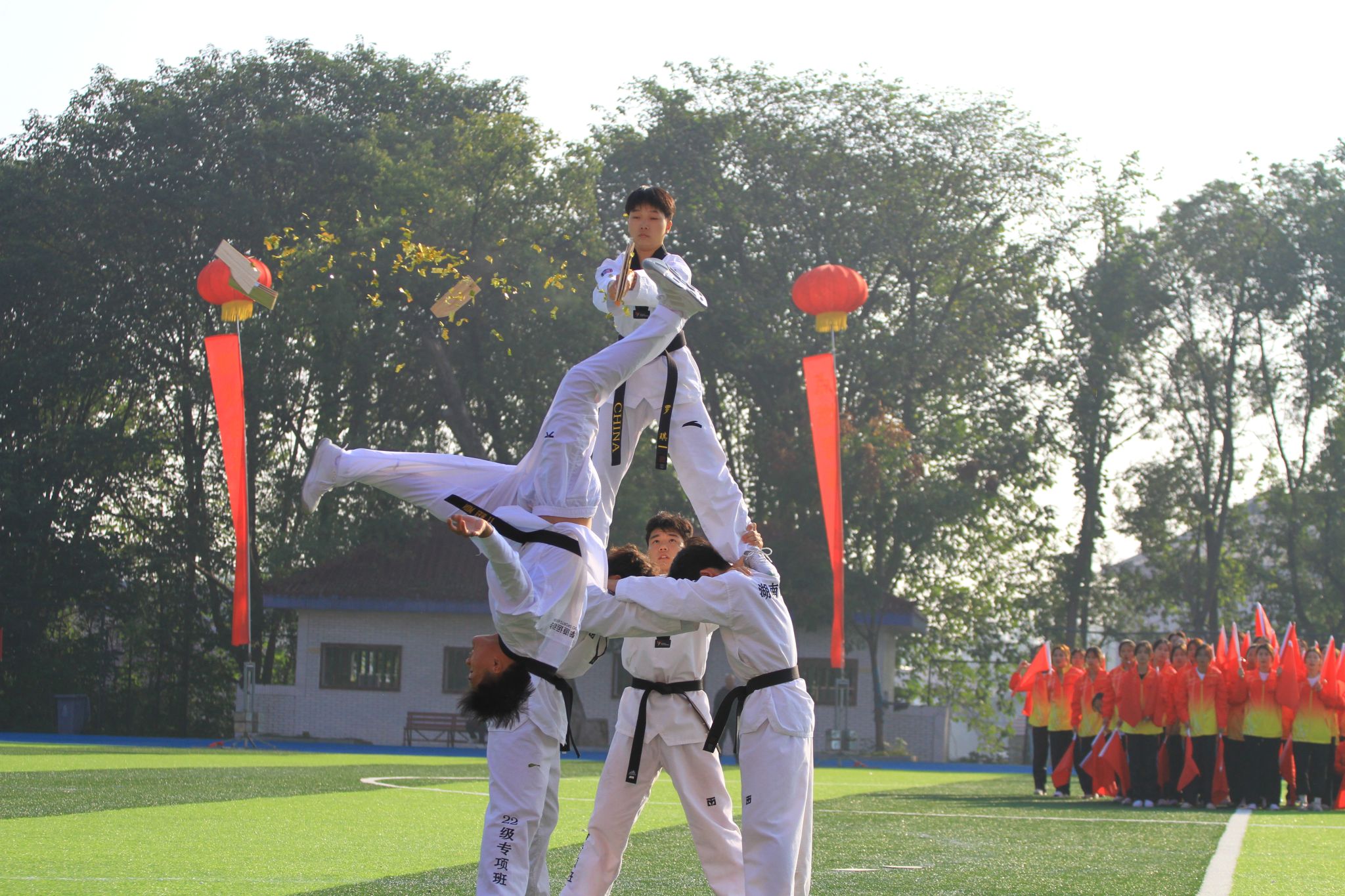 五颜六色的气球放飞天空,全场掌声雷动。在观众热情的欢呼声中,美术与艺术学院表演了啦啦操《我和我的祖国》,紫色的花球上下翻舞,她们以崭新的力量走出盛夏,展现出科院学子的无限活力;体育学院的健儿们在《武林风采》武术表演中大显身手,东安拳打出了气势,打出了对运动健儿们的支持与信心。