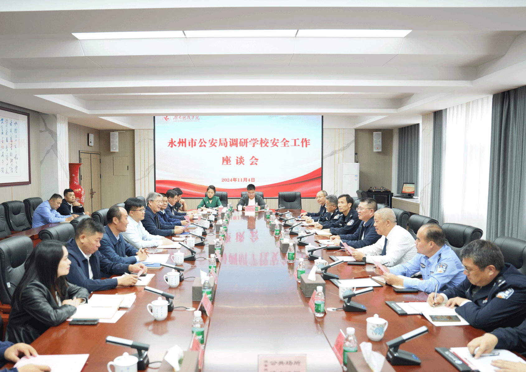 永州市公安局二级高级警长夏卫武,警令部、国保、治安、科信支队,零陵公安分局相关负责同志,我校党政办公室、学生工作部、教务处、基建处、保卫部、国际交流处、后勤服务中心等相关部门负责人参加座谈。