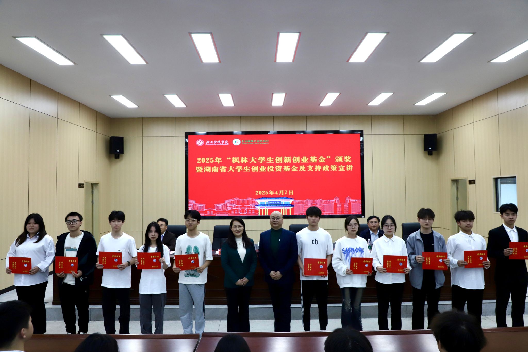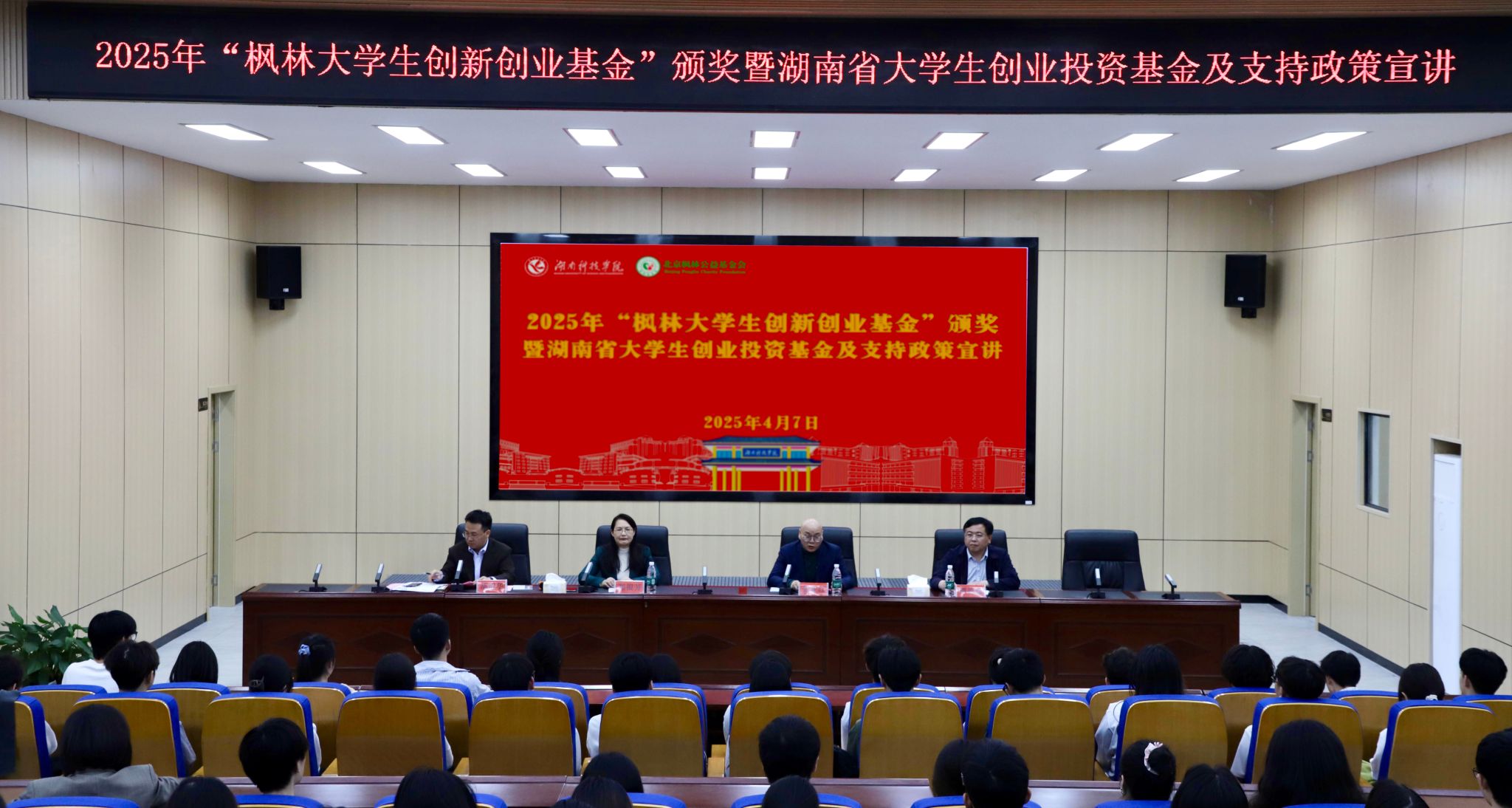本网讯(记者 刘斌 唐晶 摄影 潘加)4月7日,2025年“枫林大学生创新创业基金”颁奖仪式暨湖南省大学生创业投资基金及支持政策宣讲活动在我校举行。我校77级校友、北京枫林公益基金会会长张亚红,副校长郑银芳出席活动,34个获基金资助的学生创业项目负责人、指导老师代表以及相关工作人员参加。
