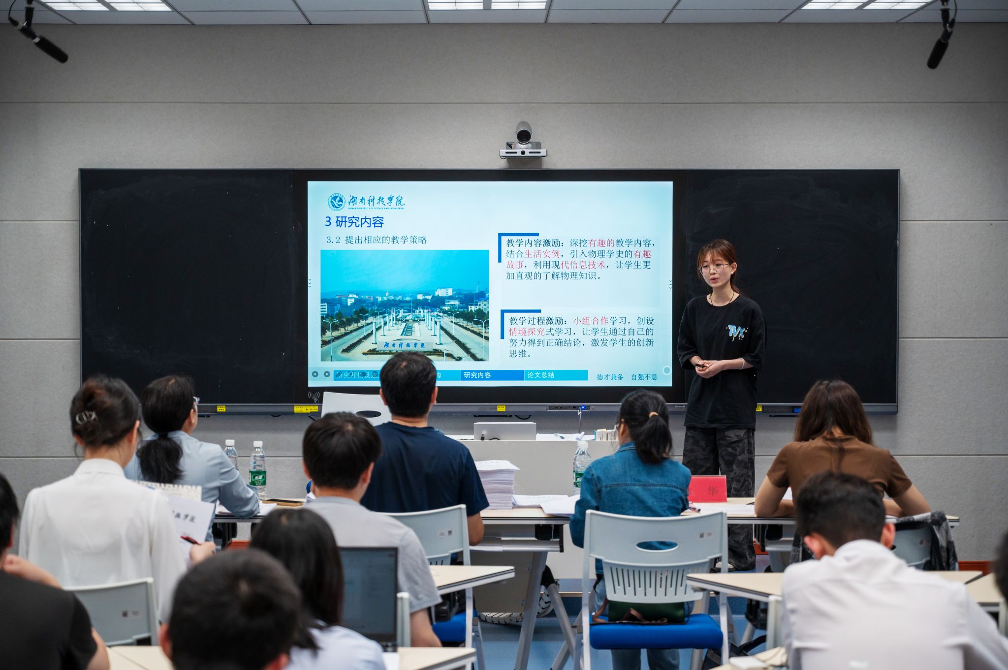 5月17日,校级现场答辩工作全面展开。全校共设5个答辩组,覆盖电子信息工程、法学、舞蹈学等14个专业的152名学生。答辩包括专家评阅论文、毕业生PPT汇报、现场答辩等三个环节,专家从“检验真伪、检测能力、查补不足”三个维度对答辩学生的专业知识掌握和应用情况进行考察。