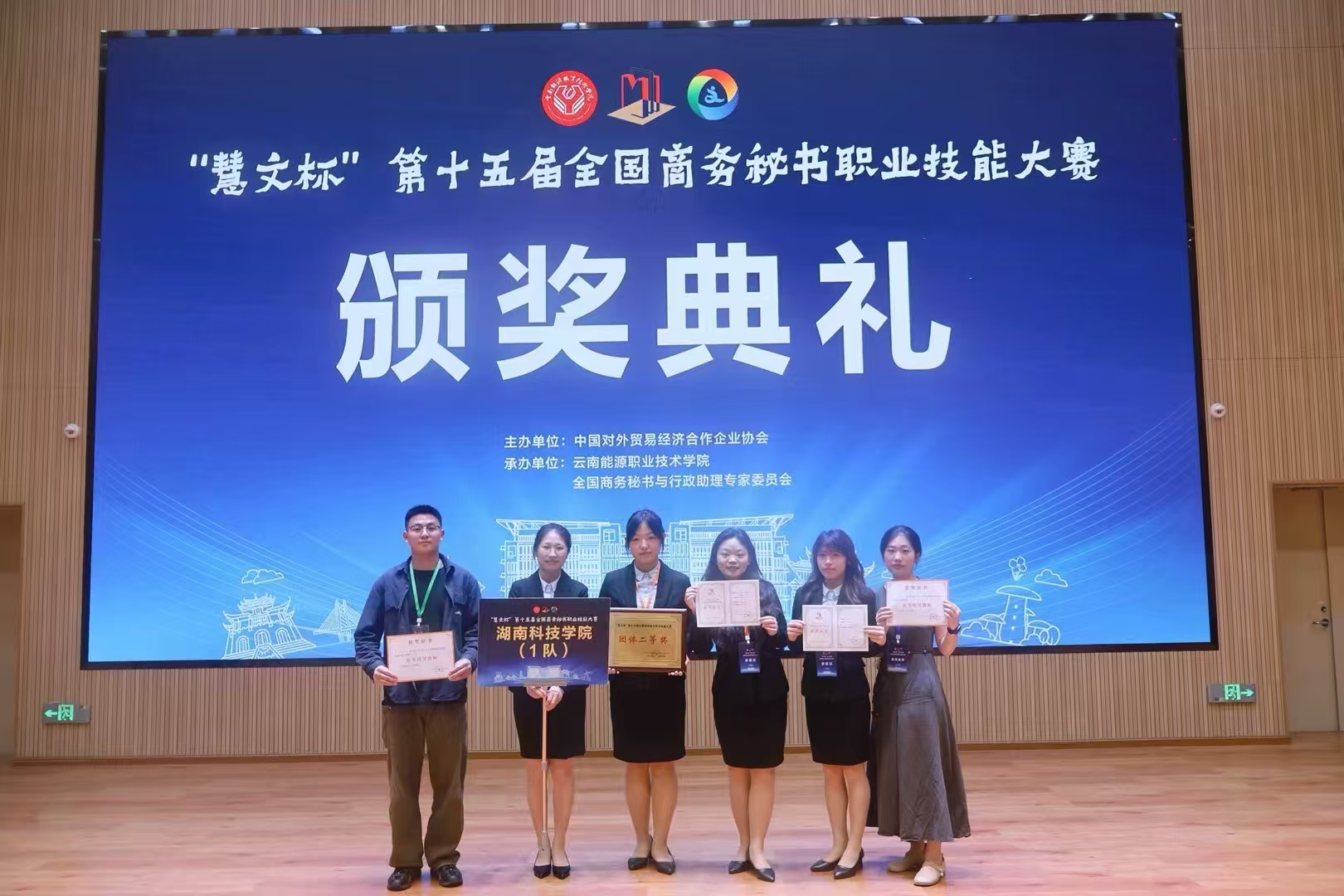 本网讯(通讯员 张紫妍)近日,“慧文杯”第十五届全国商务秘书职业技能大赛在云南曲靖举办。在我校文法学院谷显明、尹华君、曾芳、宋艳旭、何建良、莫顺斌等老师的指导下,由范庆奇、周雯老师带队,秘书专业学生张紫妍、余鑫熠、谭晶、董依岚同学组成的参赛队伍凭借扎实的专业功底和出色的现场发挥,在本次大赛中荣获团体二等奖,董依岚同学斩获秘书专项事务处理个人三等奖的优异成绩。