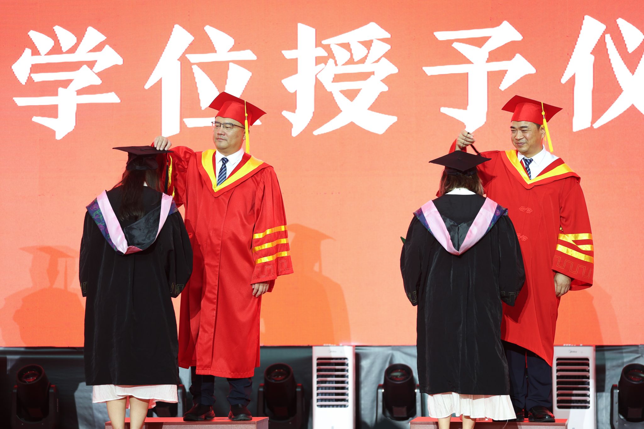 学位授予仪式上,全体校领导为毕业生拨穗并颁发毕业证书,为他们的大学四年划上了圆满句号。