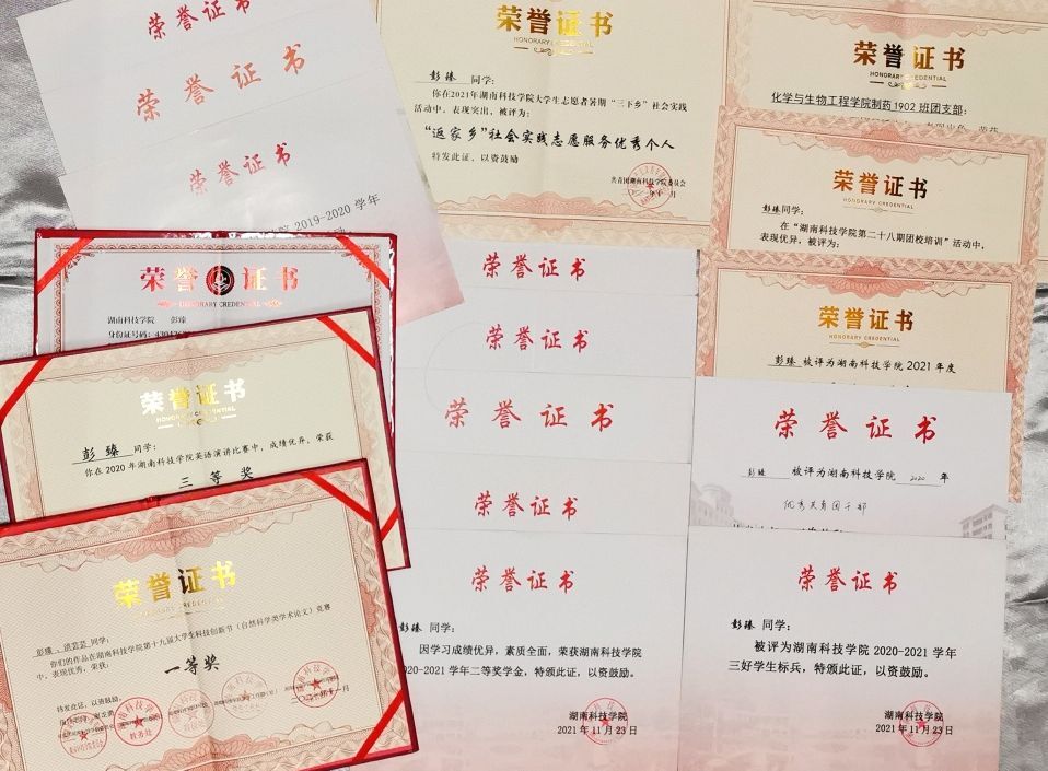 彭臻:化学与生物工程学院制药工程1902班学生,连续三年班级专业第一名,发表SCI学术论文2篇,荣获省赛特等奖等各类奖项24项,爱好钢琴并考取中央音乐协会钢琴四级证书,乐于参加各项志愿服务活动,目前凭借优异成绩获得直博西湖大学的offer!