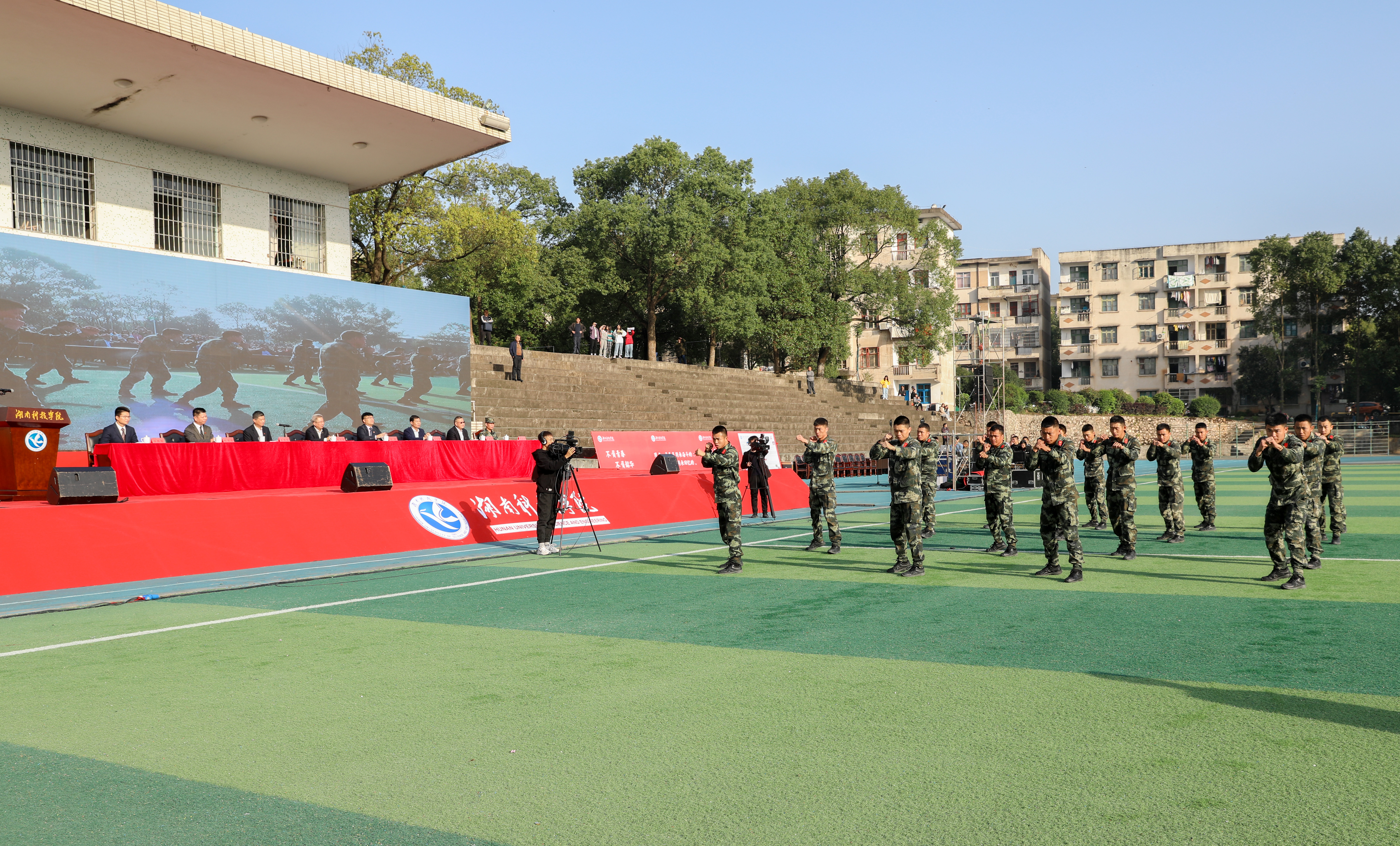 会议在雄壮的国歌中开幕。在优秀连队队列展示环节,同学们整齐步伐、嘹亮口号、昂扬斗志,展示了当代大学生朝气蓬勃、积极向上、热爱祖国、关注国防的亮丽风采。随后,军训教官进行队列和擒敌术表演,铿锵有力,动作精准,精彩的表演赢得现场阵阵掌声。