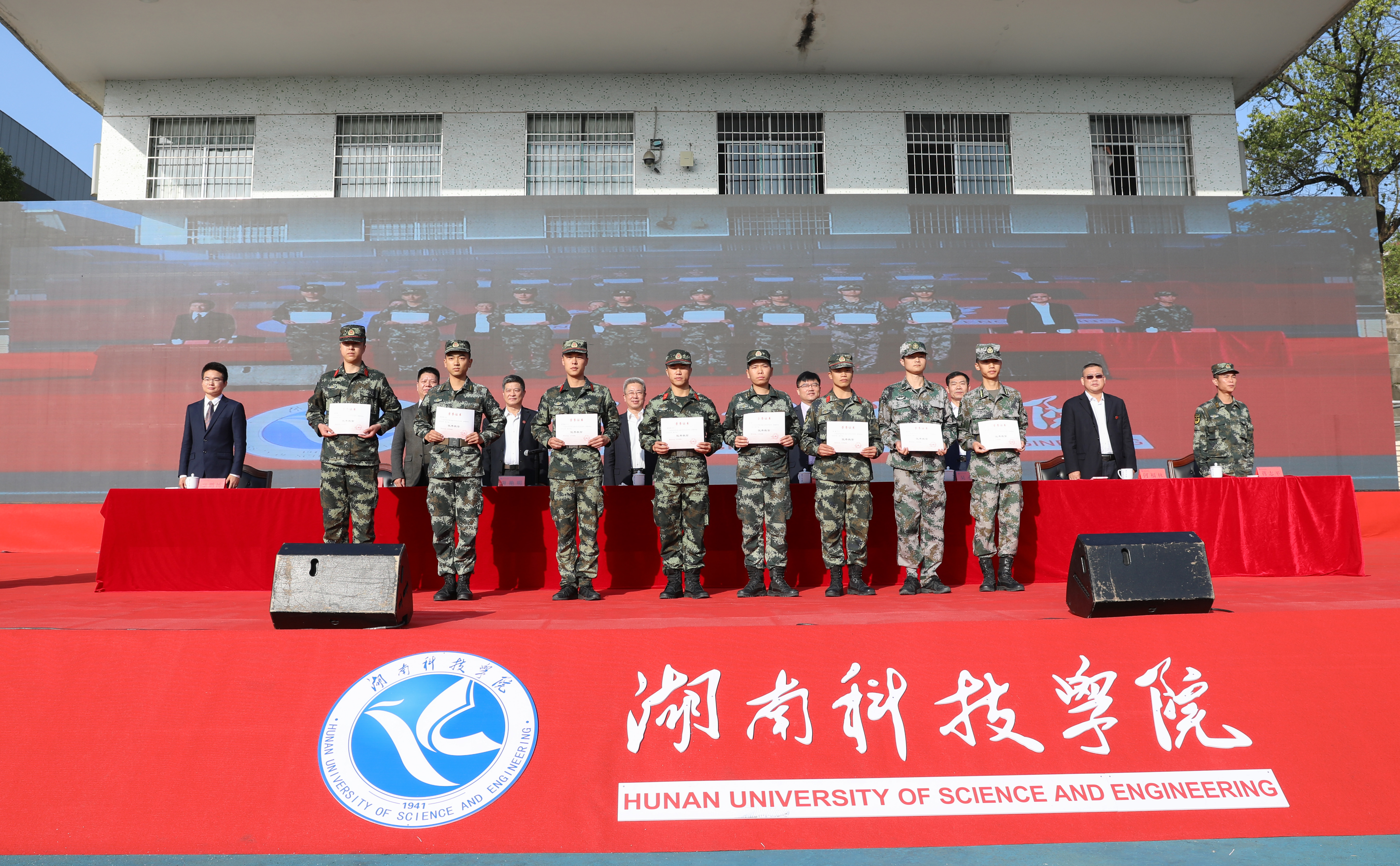 程智开宣读军训表彰文件,对音乐与舞蹈学院等5个军训工作先进单位、二营一连等25个优秀连队、曾健君等30名优秀教官以及桃园学生宿舍三栋A座613等53间优秀宿舍进行表彰。校领导为获奖单位和个人颁奖。
