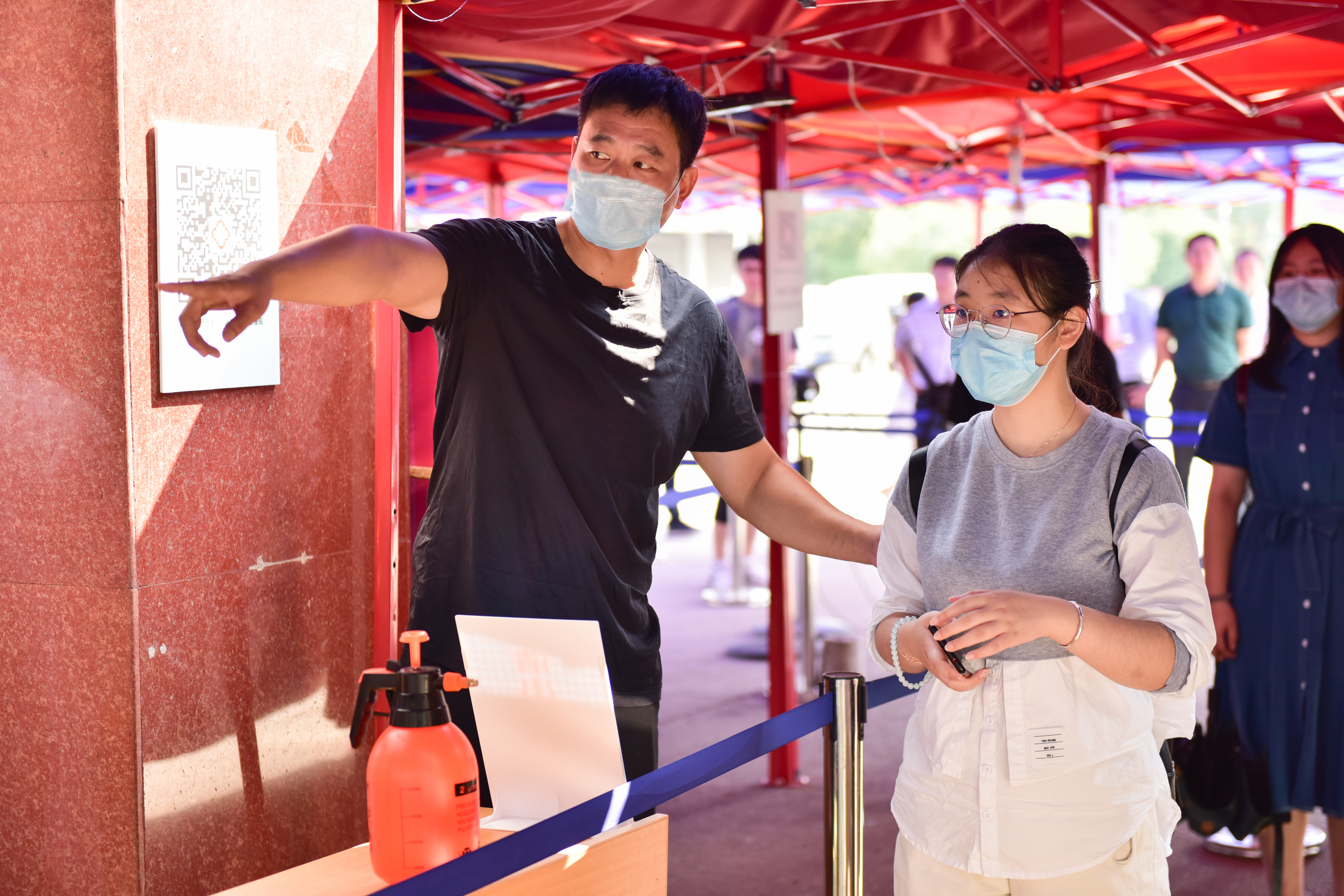 演练中,返校学生佩戴口罩按指示标识排队等候进校,每人间隔1.5米。经值班辅导员引导到“入校通道”,接受健康码核验,显示为绿色且无中高风险地区旅居史的学生,即可至东大门体温监测区进行体温检测,体温正常者可有序进校。如中高风险地区旅居史的学生,还需出示开学前7天内的核酸检测健康报告或相关的健康材料。