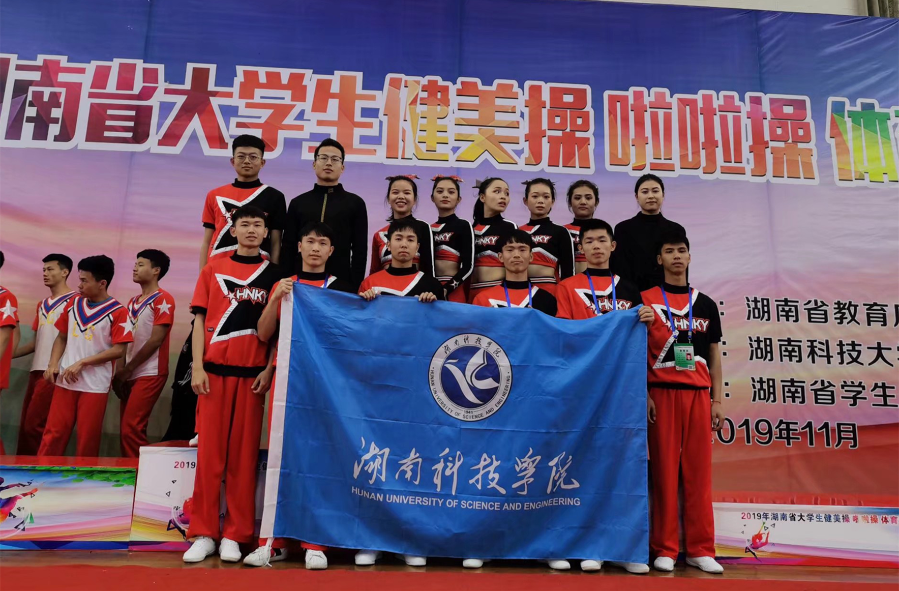 本网讯 近日,2019年湖南省大学生健美操、啦啦啦操比赛在湖南科技大学举行。由体育学院盘华和郑华艳老师指导,龙福亮、贺腾芳、何旭、刘运成、刘宁、王鼎、凌雨薇、谭宇玲、颜思、刘坚、刘钊、龙韵曲、卜泰源、刘龙组成的健美操队获得啦啦操集体技巧第一名。