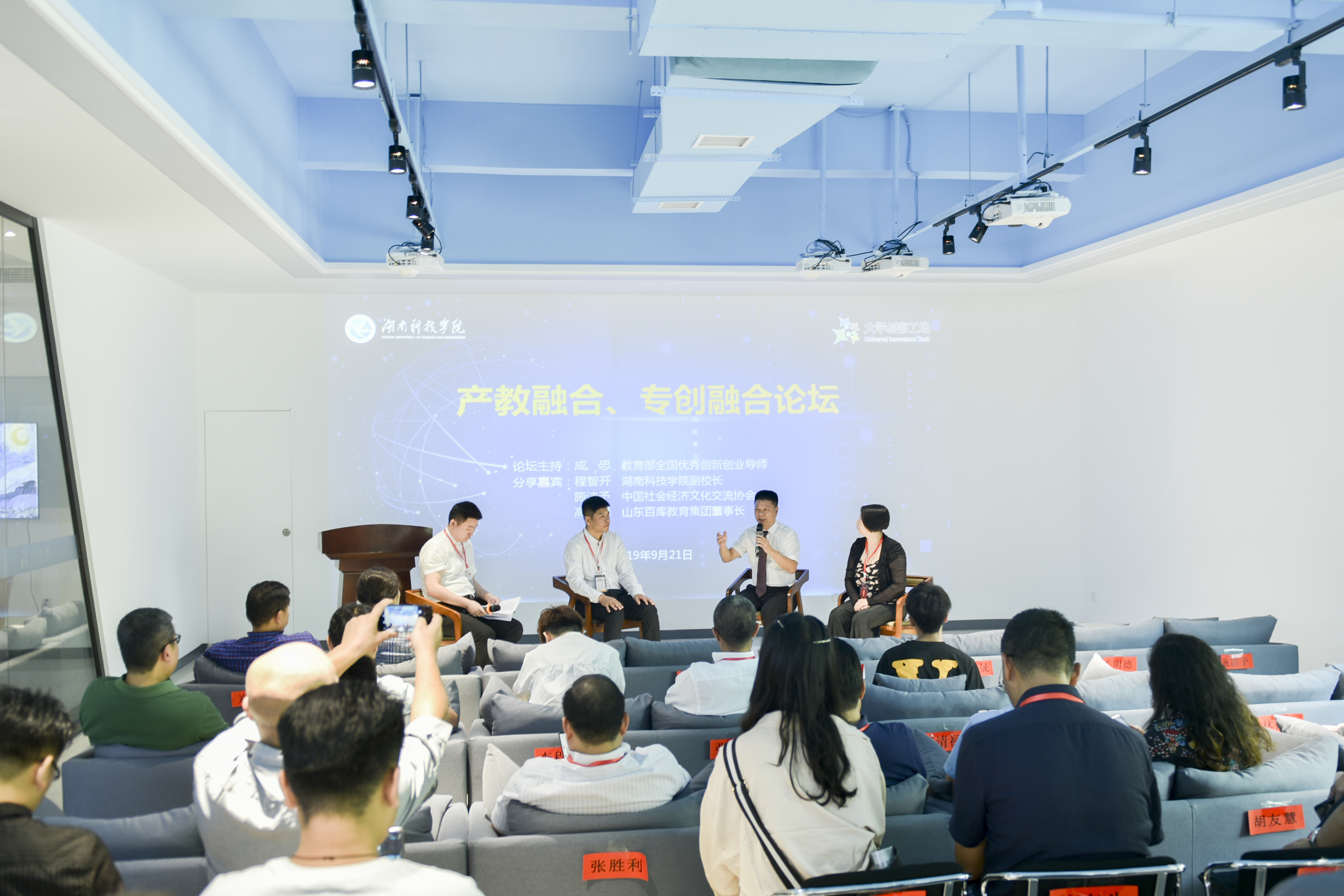 在产教融合专创融合论坛上,程智开与中国社会经济文化交流协会施洁予、山东百库教育集团董事长高清禄、资深创新创业导师成忠共同进行交流分享,就推动高校人才培养模式改革,切实支持大学生开展创新创业实践,引导高校科研成果向市场转化等方面进行交流并发表了看法。