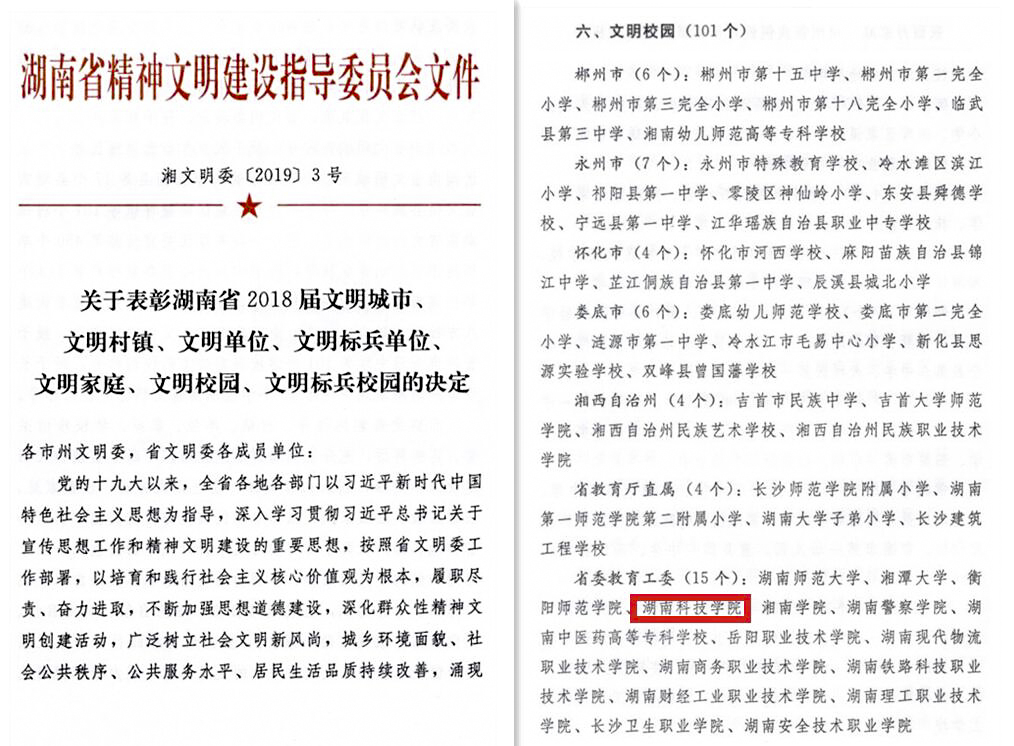 本网讯 近日,湖南省精神文明建设指导委员会下发文件(湘文明委﹝2019﹞3号),我校名列其中,获评2018届“湖南省文明校园”。