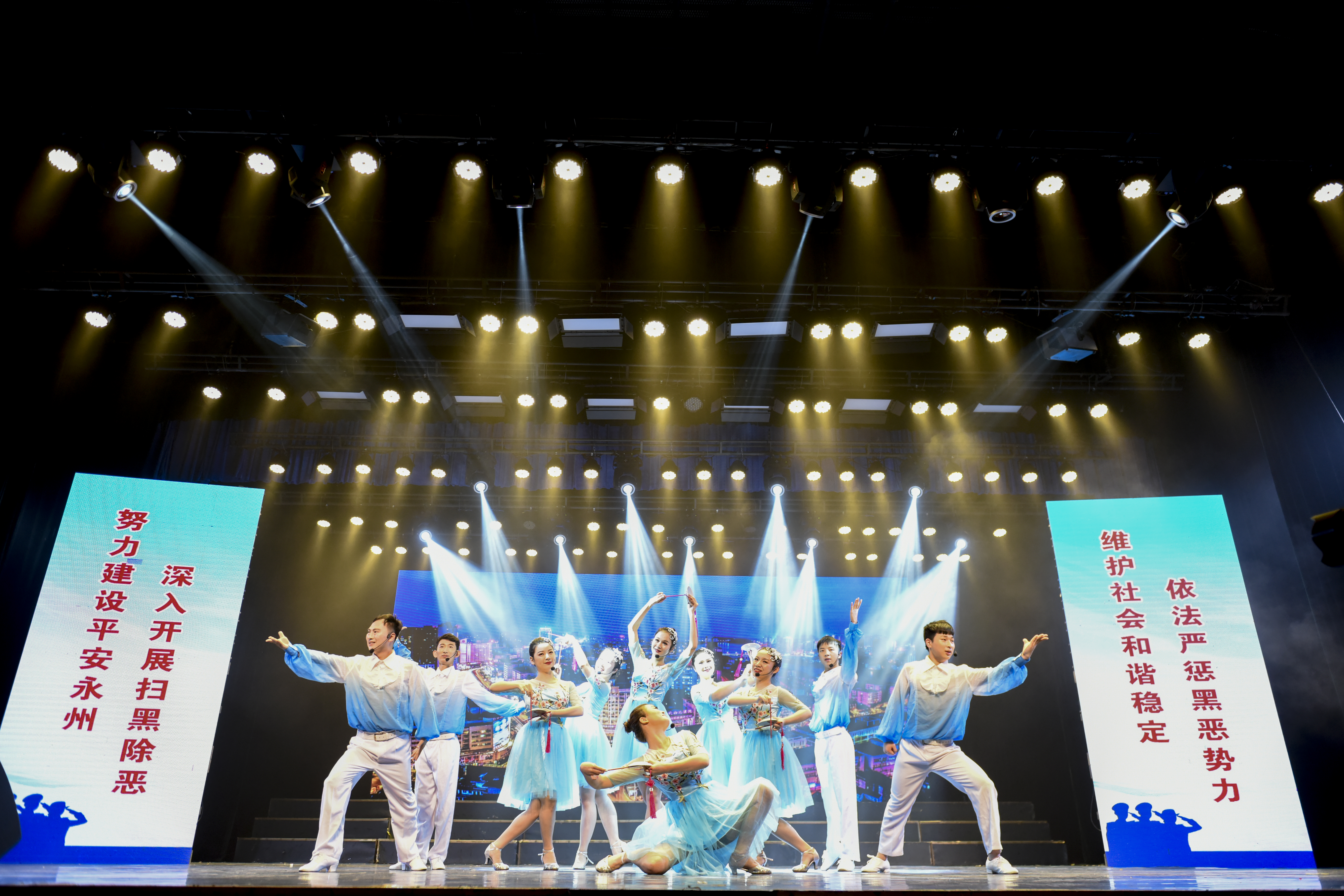 大气磅礴的舞蹈、气势恢宏的演出、奋战一线的勇敢精神、不惧危险的英雄本色,开场舞《利剑》为观众演绎了扫黑除恶的“速度与激情”。歌曲《扫黑除恶之歌》与《扫黑除恶 造福人民》充分展现了永州公安在扫黑除恶一线惩恶扬善、不畏强权、除暴安民的英勇斗志和构筑长治久安的坚强决心。