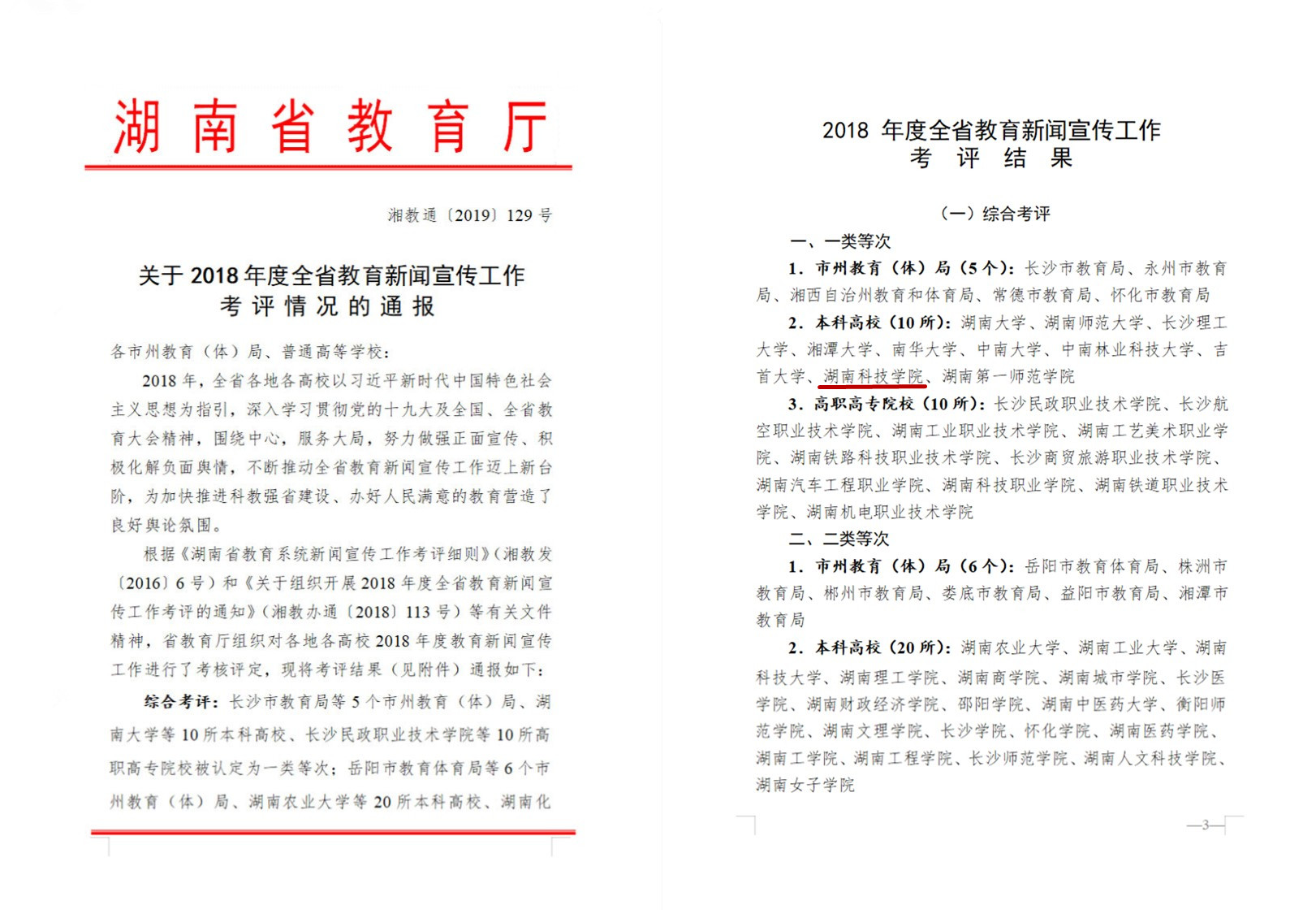 本网讯  近日,湖南省教育厅下发《关于2018年度全省教育新闻宣传工作考评情况的通报》,我校在2018年度全省教育新闻宣传工作综合考评中获评一类等次(优秀),这是我校第四次获此殊荣。