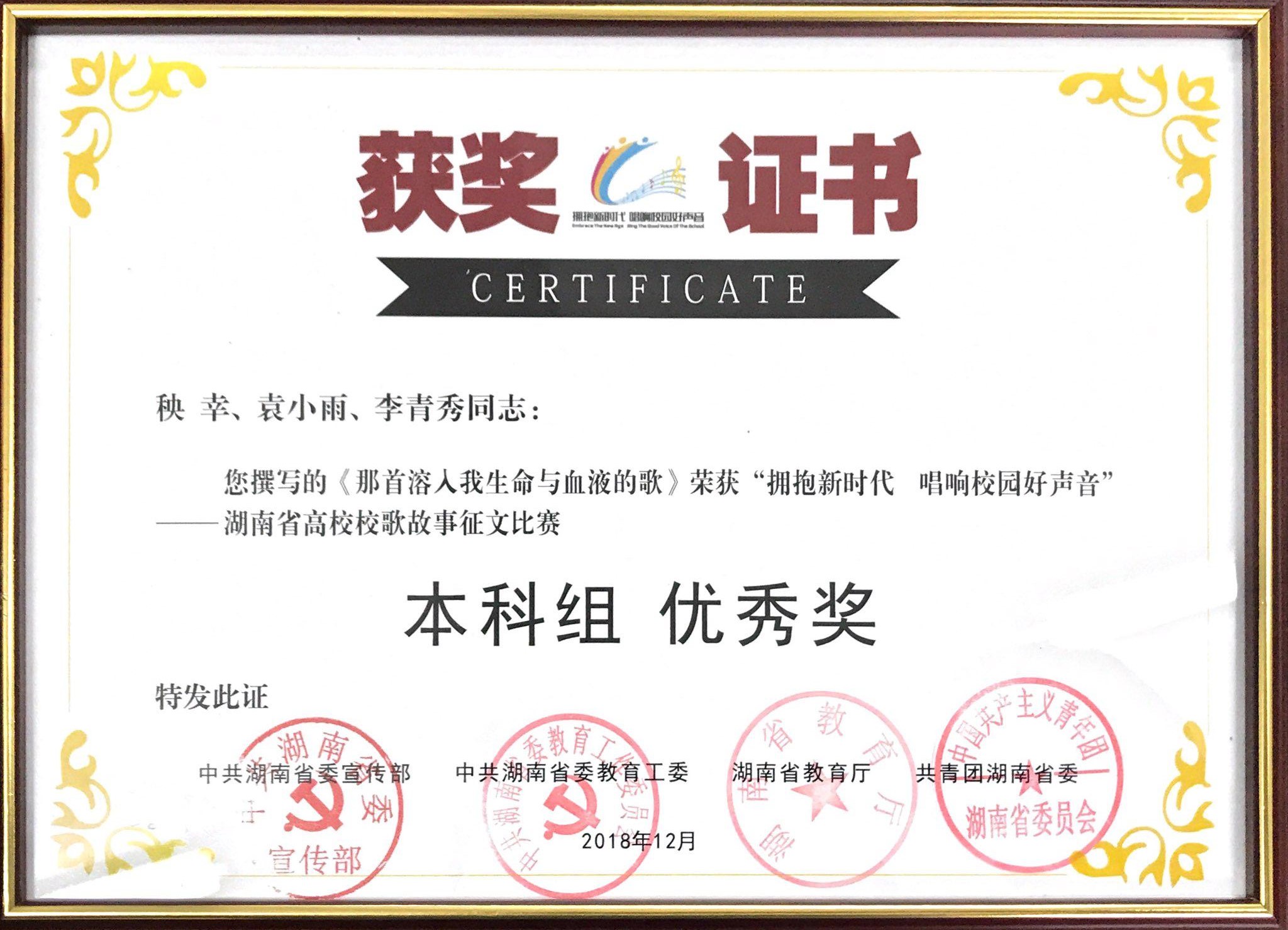 本网讯 12月28日下午,由中共湖南省委宣传部、中共湖南省委教育工委、湖南省教育厅、共青团湖南省委主办的湖南省第五届校园文化论坛暨全省高校校歌系列主题活动颁奖典礼在湖南教育电视台举办,我校校歌《潇湘之歌》荣获校歌演绎二等奖,进入全省本科院校前八名,学生秧幸、袁小雨、李青秀作品《那首溶入我生命与血液的歌》获校歌故事征文优秀奖。副校长程智开出席颁奖典礼。