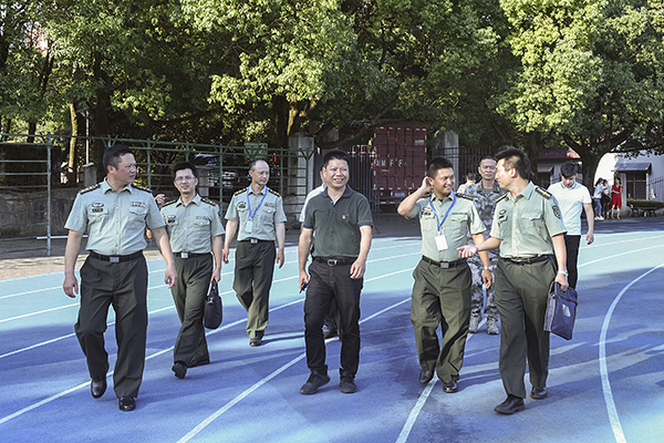 本网讯 9月20日下午,省军训工作检查小组成员尚国华中校,省军区军训办参谋胡涛,永州军分区战备建设处处长张玉龙上校,零陵区武装部政委孙国颖上校以及市教育局相关人员来校检查指导军训工作,副校长程智开陪同参加。